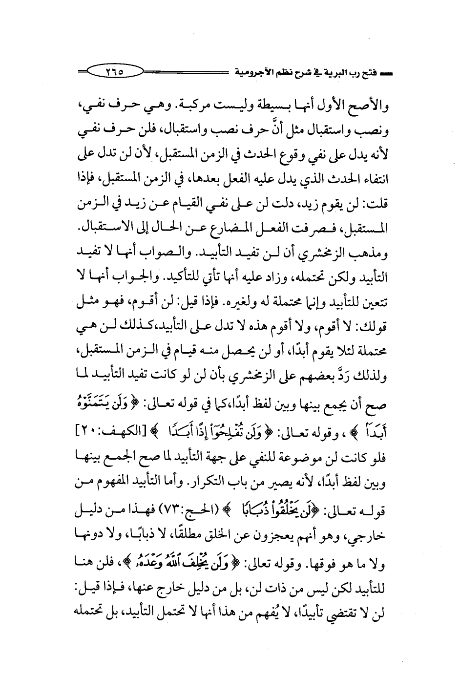 (وَلَنْ يُخْلِفَ اللَّهُ وَعْدَهُ) (الحج: من الآية47) فلن هنا للتأبيد لكن ليس من ذات لن، بل من دليل خارج عنها، فإذا قيل: لن لا تقتضي تأبيدًا، لا يُفهم من هذا أنها لا تحتمل التأبيد، بل تحتمله