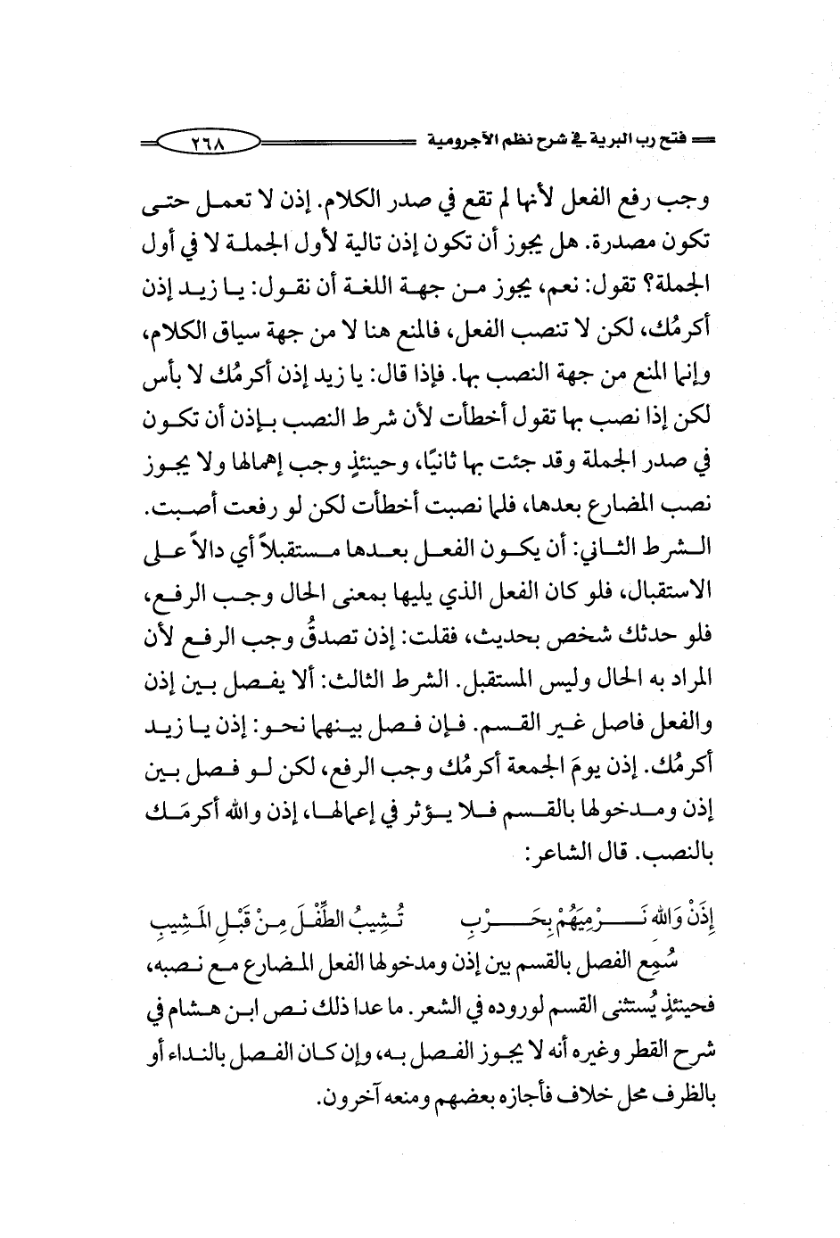 الشرط الثالث: ألا يفصل بين إذن والفعل فاصل غير القسم. فإن فصل بينهما نحو: إذن يا زيد أكرمُك. إذن يومَ الجمعة أكرمُك وجب الرفع، لكن لو فصل بين إذن ومدخولها بالقسم فلا يؤثر في إعمالها، إذن والله أكرمَك بالنصب. قال الشاعر:
