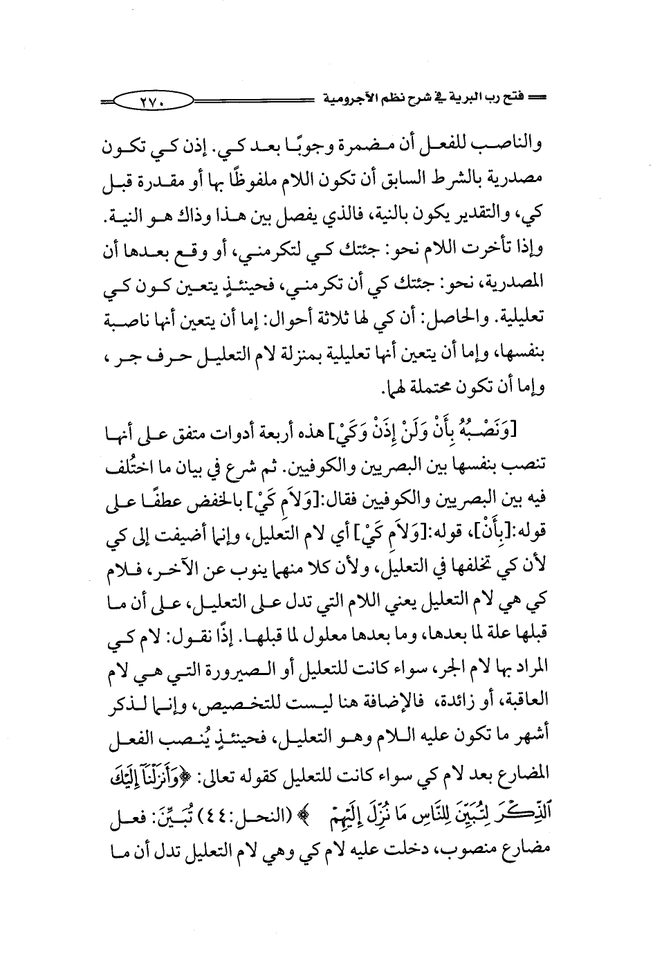 [وَنَصْبُهُ بِأَنْ وَلَنْ إِذَنْ وَكَيْ] هذه أربعة أدوات متفق على أنها تنصب بنفسها بين البصريين والكوفيين. ثم شرع في بيان ما اختُلف فيه بين البصريين والكوفيين فقال: [وَلاَمِ كَيْ] بالخفض عطفًا على قوله: [بِأَنْ]، قوله: [وَلاَمِ كَيْ] أي لام التعليل، وإنما أضيفت إلى كي لأن كي تخلفها في التعليل، ولأن كلا منهما ينوب عن الآخر، فلام كي هي لام التعليل يعني اللام التي تدل على التعليل، على أن ما قبلها علة لما بعدها، وما بعدها معلول لما قبلها. إذن نقول: لام كي المراد بها لام الجر، سواء كانت للتعليل أو الصيرورة التي هي لام العاقبة، أو زائدة، فالإضافة هنا ليست للتخصيص، وإنما لذكر أشهر ما تكون عليه اللام وهو التعليل، فحينئذٍ يُنصب الفعل المضارع بعد لام كي سواء كانت للتعليل كقوله تعالى: {وَأَنْزَلْنَا إِلَيْكَ الذِّكْرَ لِتُبَيِّنَ لِلنَّاسِ مَا نُزِّلَ إِلَيْهِمْ} (النحل:44) تُبَيِّنَ: فعل مضارع منصوب، دخلت عليه لام كي وهي لام التعليل تدل أن ما