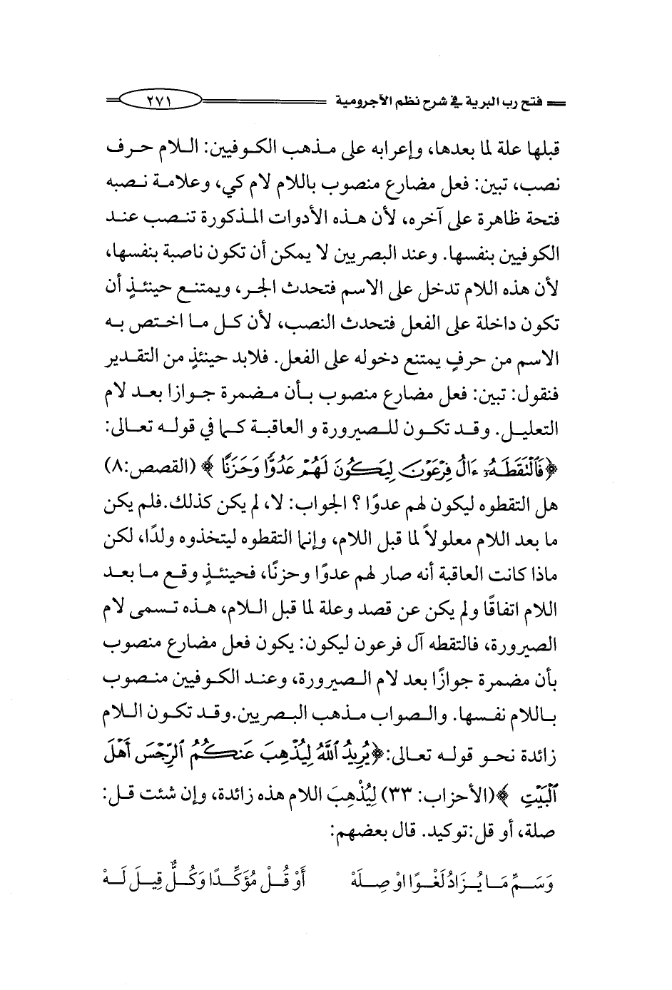 قبلها علة لما بعدها، وإعرابه على مذهب الكوفيين: اللام حرف نصب، تبين: فعل مضارع منصوب باللام لام كي، وعلامة نصبه فتحة ظاهرة على آخره، لأن هذه الأدوات المذكورة تنصب عند الكوفيين بنفسها. وعند البصريين لا يمكن أن تكون ناصبة بنفسها، لأن هذه اللام تدخل على الاسم فتحدث الجر، ويمتنع حينئذٍ أن تكون داخلة على الفعل فتحدث النصب، لأن كل ما اختص به الاسم من حرفٍ أو غيره يمتنع دخوله على الفعل. فلابد حينئذٍ من التقدير فنقول: تبين: فعل مضارع منصوب بأن مضمرة جوازا بعد لام التعليل. وقد تكون للصيرورة والعاقبة كما في قوله تعالى: {فَالْتَقَطَهُ آلُ فِرْعَوْنَ لِيَكُونَ لَهُمْ عَدُوّاً وَحَزَناً} (القصص:8) هل التقطوه ليكون لهم عدوًا؟ لا شك لا، لم يكن كذلك. فلم يكن ما بعد اللام معلولاً لما قبل اللام، وإنما التقطوه ليتخذوه ولدًا، لكن ماذا كانت العاقبة أنه صار لهم عدوًا وحزنًا، فحينئذٍ وقع ما بعد اللام اتفاقًا ولم يكن عن قصد وعلة لما قبل اللام، هذه تسمى لام الصيرورة، فالتقطه آل فرعون ليكون: يكون فعل مضارع منصوب بأن مضمرة جوازًا بعد لام الصيرورة، وعند الكوفيين منصوب باللام نفسها. والصواب مذهب البصريين. وقد تكون اللام زائدة نحو: {يُرِيدُ اللَّهُ لِيُذْهِبَ عَنْكُمُ الرِّجْسَ أَهْلَ الْبَيْتِ} (الأحزاب:33) لِيُذْهِبَ اللام هذه زائدة، وإن شئت قل: صلة، أو قل: توكيد. قال بعضهم: