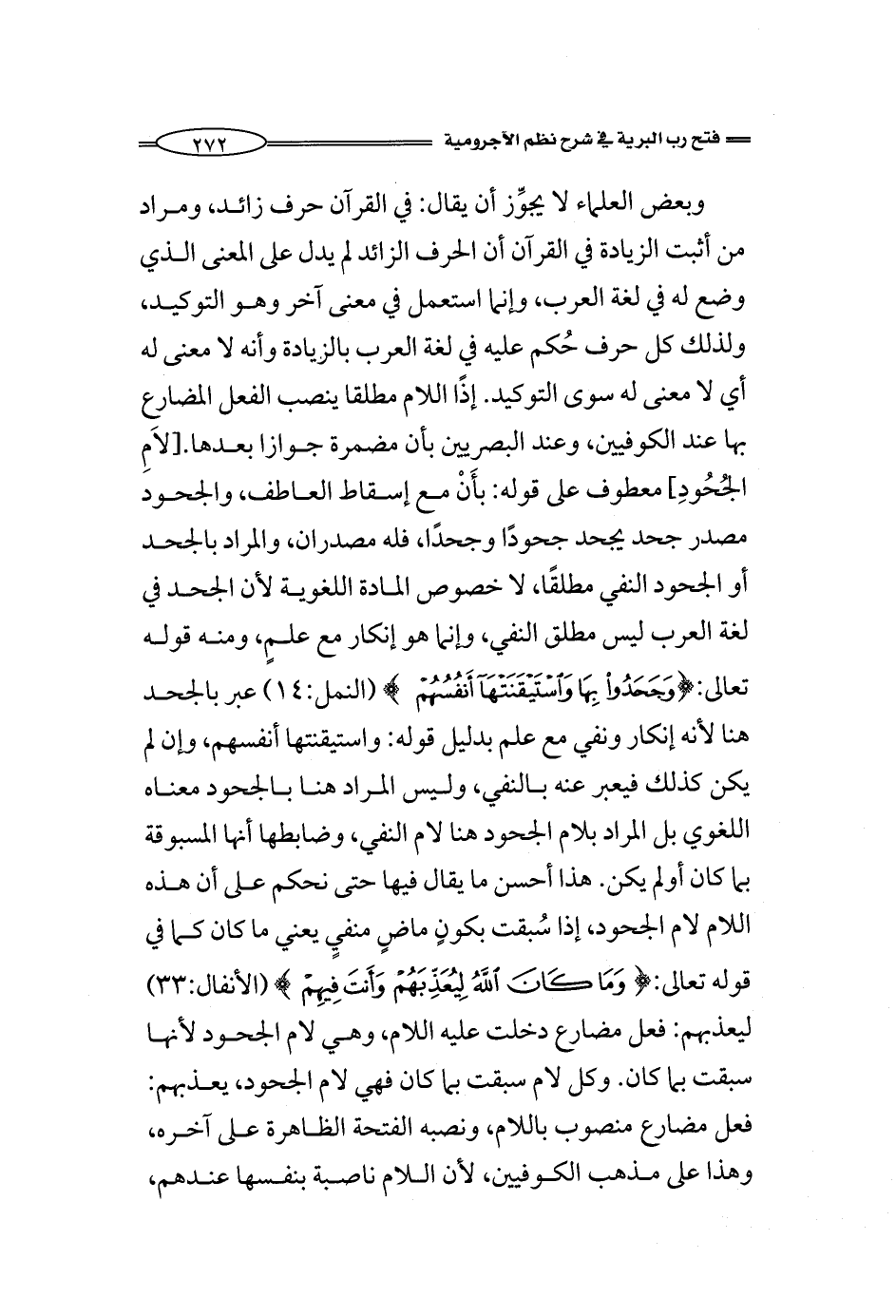 وبعض العلماء لا يجوِّز أن يقال: في القرآن حرف زائد، ومراد من أثبت الزيادة في القرآن أن الحرف الزائد لم يدل على المعنى الذي وضع له في لغة العرب، وإنما استعمل في معنى آخر وهو التوكيد، ولذلك كل حرف حُكم عليه في لغة العرب بالزيادة وأنه لا معنى له أي لا معنى له سوى التوكيد. إذًا اللام مطلقا ينصب الفعل المضارع بها عند الكوفيين، وعند البصريين بأن مضمرة جوازا بعدها. [لاَمِ الجُحُودِ] معطوف على قوله: بأن مع إسقاط العاطف، والجحود مصدر جحد يجحد جحودًا وجحدًا، فله مصدران، والمراد بالجحد أو الجحود النفي مطلقًا، لا خصوص المادة اللغوية لأن الجحد في لغة العرب ليس مطلق النفي، وإنما هو إنكار مع علمٍ، ومنه قوله: {وَجَحَدُوا بِهَا وَاسْتَيْقَنَتْهَا أَنْفُسُهُمْ} (النمل:14) عبر بالجحد هنا لأنه إنكار ونفي مع علم بدليل قوله: واستيقنتها أنفسهم، وإن لم يكن كذلك فيعبر عنه بالنفي، وليس المراد هنا بالجحود معناه اللغوي بل المراد بلام الجحود هنا لام النفي، وضابطها أنها المسبوقة بما كان أولم يكن. هذا أحسن ما يقال فيها حتى نحكم على أن هذه اللام لام الجحود، إذا سُبقت بكونٍ ماضٍ منفيٍ يعني ما كان كما في قوله تعالى: {وَمَا كَانَ اللَّهُ لِيُعَذِّبَهُمْ وَأَنْتَ فِيهِمْ} (الأنفال:33) ليعذبهم: فعل مضارع دخلت عليه اللام، وهي لام الجحود لأنها سبقت بما كان. وكل لام سبقت بما كان فهي لام الجحود، يعذبهم: فعل مضارع منصوب باللام، وعلامة نصبه الفتحة الظاهرة على آخره، وهذا على مذهب الكوفيين، لأن اللام ناصبة بنفسها عندهم،