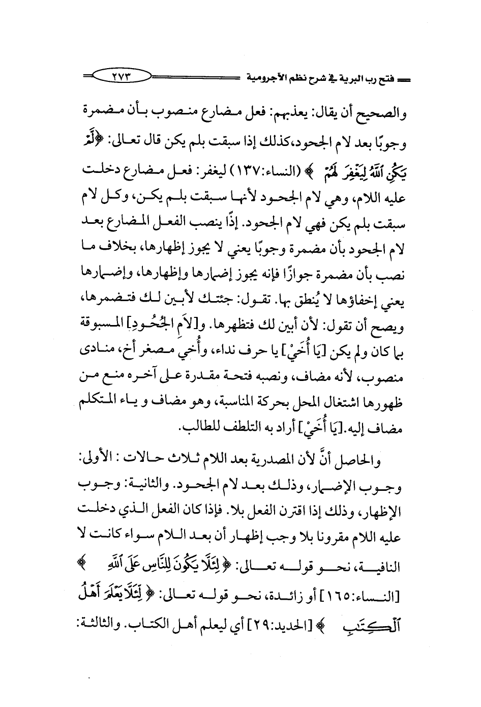 والحاصل أنَّ لأن المصدرية بعد اللام ثلاث حالات: الأولى: وجوب الإضمار، وذلك بعد لام الجحود. والثانية: وجوب الإظهار، وذلك إذا اقترن الفعل بلا. فإذا كان الفعل الذي دخلت عليه اللام مقرونا بلا وجب إظهار أن بعد اللام سواء كانت لا النافية، نحو قوله تعالى: (لِئَلَّا يَكُونَ لِلنَّاسِ عَلَى اللَّه) [النساء:165] أو زائدة، نحو قوله تعالى: (لِئَلَّا يَعْلَمَ أَهْلُ الْكِتَابِ) [الحديد:29] أي ليعلم أهل الكتاب. والثالثة: