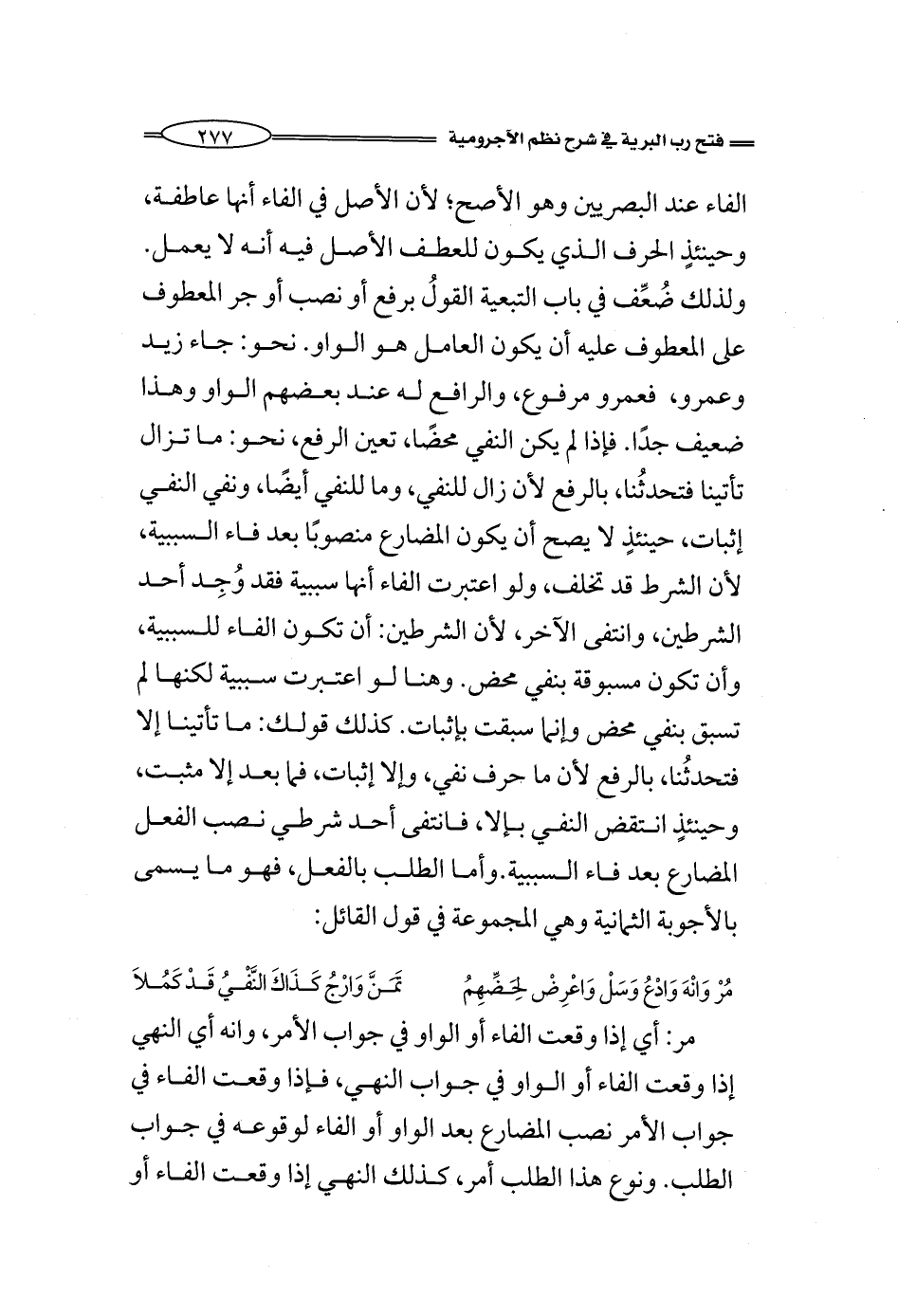 الفاء عند البصريين وهو الأصح؛ لأن الأصل في الفاء أنها تكون عاطفة، وحينئذٍ الحرف الذي يكون للعطف الأصل فيه أنه لا يعمل. ولذلك ضُعِّف في باب التبعية القولُ برفع أو نصب أو جر المعطوف على المعطوف عليه أن يكون العامل هو الواو. نحو: جاء زيد وعمرو، فعمرو مرفوع، والرافع له عند بعضهم الواو وهذا ضعيف جدًا. فإذا لم يكن النفي محضًا، تعين الرفع، نحو: ما تزال تأتينا فتحدثُنا، بالرفع لأن زال للنفي، وما للنفي أيضًا، ونفي النفي إثبات، حينئذٍ لا يصح أن يكون المضارع منصوبًا بعد فاء السببية، لأن الشرط قد تخلف، ولو اعتبرت الفاء أنها سببية فقد وُجِد أحد الشرطين، وانتفى الآخر، لأن الشرطين: أن تكون الفاء للسببية، وأن تكون مسبوقة بنفي محض. وهنا لو اعتبرت سببية لكنها لم تسبق بنفي محض وإنما سبقت بإثبات. كذلك قولك: ما تأتينا إلا فتحدثُنا، بالرفع لأن ما حرف نفي، وإلا إثبات، فما بعد إلا مثبت، وحينئذٍ انتقض النفي بإلا، فانتفى أحد شرطي نصب الفعل المضارع بعد فاء السببية. وأما الطلب بالفعل، فهو ما يسمى بالأجوبة الثمانية وهي المجموعة في قول القائل: