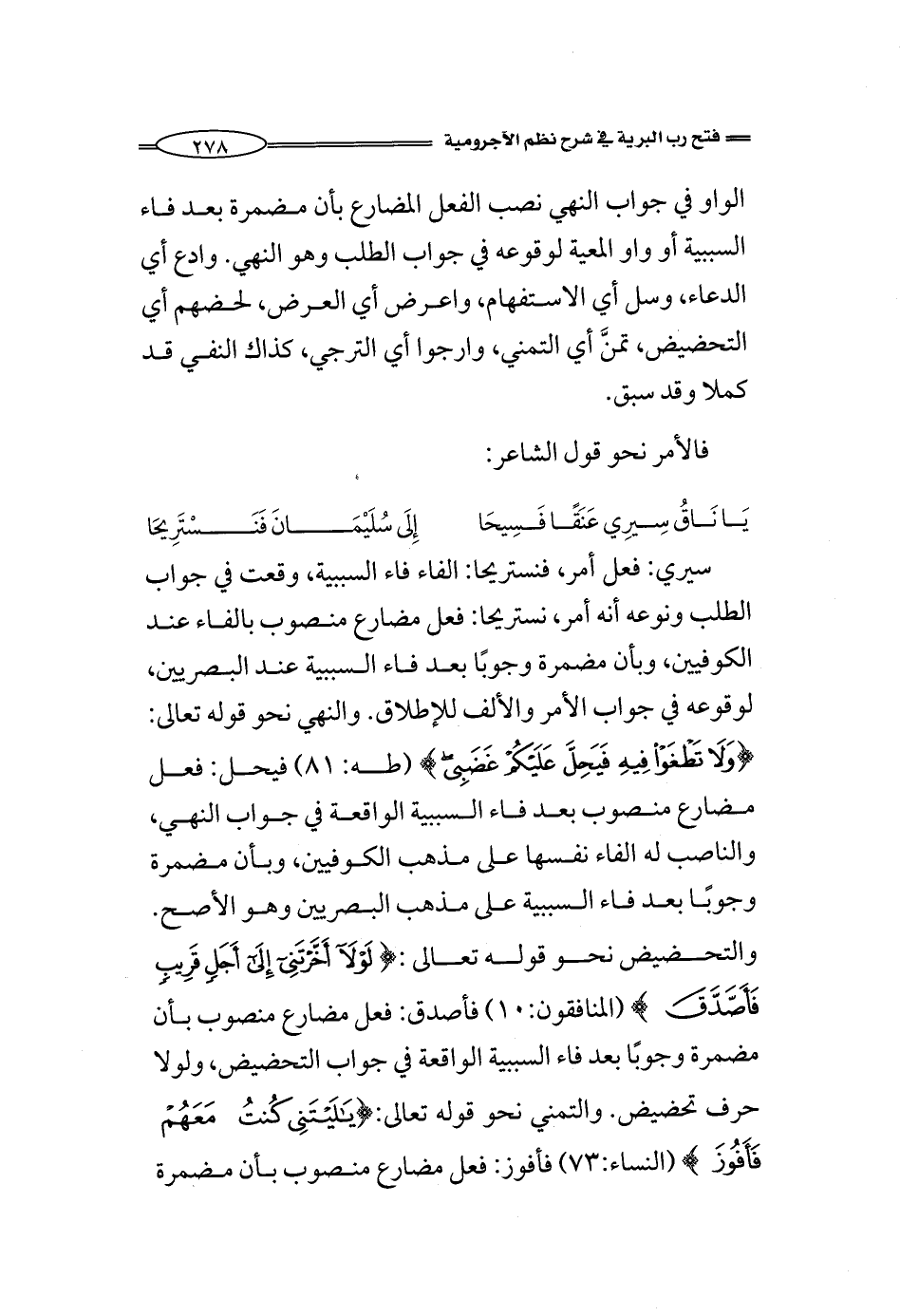 سيري: هذا فعل أمر، فنستريحا: الفاء فاء السببية، وقعت في جواب الطلب ونوعه أنه أمر، نستريحا: فعل مضارع منصوب بالفاء عند الكوفيين، وبأن مضمرة وجوبًا بعد فاء السببية عند البصريين، لوقوعه في جواب الأمر والألف للإطلاق. والنهي نحو قوله تعالى: {وَلا تَطْغَوْا فِيهِ فَيَحِلَّ عَلَيْكُمْ غَضَبِي} (طه:81) فيحل: فعل مضارع منصوب لوقوعه بعد فاء السببية الواقعة في جواب النهي، والناصب له الفاء نفسها على مذهب الكوفيين، وبأن مضمرة وجوبًا بعد فاء السببية على مذهب البصريين وهو الأصح. والتحضيض نحو قوله تعالى: {لَوْلا أَخَّرْتَنِي إِلَى أَجَلٍ قَرِيبٍ فَأَصَّدَّقَ} (المنافقون:10) فأصدق: فعل مضارع منصوب بأن مضمرة وجوبًا بعد فاء السببية الواقعة في جواب التحضيض، ولولا حرف تحضيض. والتمني نحو قوله تعالى: {يَا لَيْتَنِي كُنْتُ مَعَهُمْ فَأَفُوزَ} (النساء:73) فأفوز: فعل مضارع منصوب بأن مضمرة