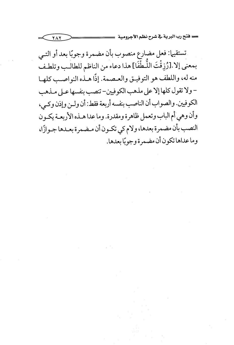 تستقيما: فعل مضارع منصوب بأن مضمرة وجوبًا بعد أو التي بمعنى إلا. [رُزِقْتَ اللُّطْفَا] هذا دعاء من الناظم للطالب وتلطف منه له، واللطف هو التوفيق والعصمة. إذًا هذه النواصب كلها - ولا تقول كلها إلا على مذهب الكوفيين- تنصب بنفسها على مذهب الكوفيين. والصواب أن الناصب بنفسه أربعة فقط: أن ولن وإذن وكي، وأن وهي أم الباب وتعمل ظاهرة ومقدرة. وما عدا هذه الأربعة يكون النصب بأن مضمرة بعدها، ولام كي تكون أن مضمرة بعدها جوازًا، وما عداها تكون أن مضمرة وجوبًا بعدها.