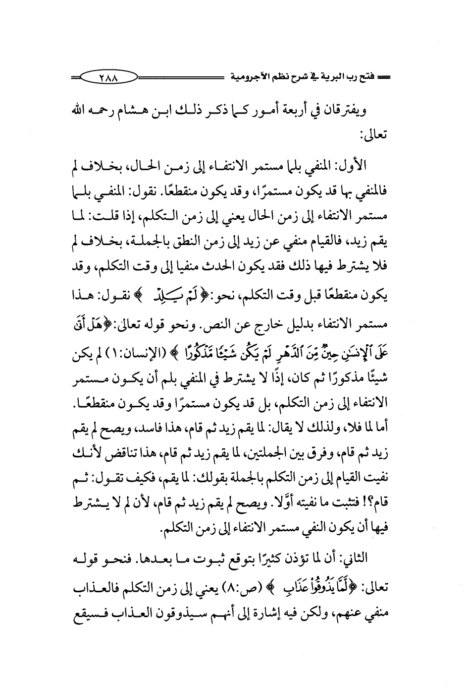 الأول: المنفي بلما مستمر الانتفاء إلى زمن الحال، بخلاف لم فالمنفي بها قد يكون مستمرًا، وقد يكون منقطعًا. نقول: المنفي بلما مستمر الانتفاء إلى زمن الحال يعني إلى زمن التكلم، إذا قلت: لما يقم زيد، القيام منفي عن زيد إلى زمن النطق بالجملة، بخلاف لم فلا يشترط فيها ذلك قد يكون الحدث منفيا إلى وقت التكلم، وقد يكون منقطعًا قبل وقت التكلم، ونحو: {لَمْ يَلِدْ} نقول: هذا مستمر الانتفاء بدليل خارج عن النص. نحو: {هَلْ أَتَى عَلَى الإِنْسَانِ حِينٌ مِنَ الدَّهْرِ لَمْ يَكُنْ شَيْئاً مَذْكُوراً} (الإنسان:1) لم يكن شيئًا مذكورًا ثم كان، إذًا لا يشترط في المنفي بلم أن يكون مستمر الانتفاء إلى زمن التكلم، بل قد يكون مستمرًا وقد يكون منقطعًا. أما لما فلا، ولذلك لا يقال: لما يقم زيد ثم قام، هذا فاسد، ويصح لم يقم زيد ثم قام، وفرق بين الجملتين، لما يقم زيد ثم قام، هذا تناقض لأنك نفيت القيام إلى زمن التكلم بالجملة بقولك: لما يقم، فكيف تقول: ثم قام؟! فتثبت ما نفيته أوَّلا. ويصح لم يقم زيد ثم قام، لأن لم لا يشترط فيها أن يكون النفي مستمر الانتفاء إلى زمن التكلم.