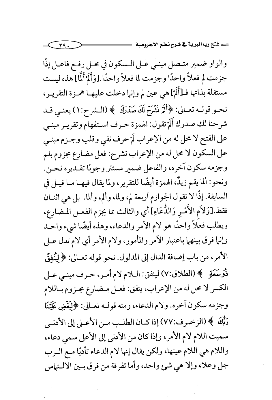 والواو ضمير متصل مبني على السكون في محل رفع فاعل إذًا جزمت لم فعلاً واحدًا وجزمت لما فعلاً واحدًا. [وَأَلَمْ أَلَمَّا] هذه ليست مستقلة بذاتها فـ[أَلَمْ] هي عين لم وإنما دخلت عليها همزة التقرير، نحو: {أَلَمْ نَشْرَحْ لَكَ صَدْرَكَ} (الشرح:1) يعني قد شرحنا لك صدرك [أَلَمْ] تقول: الهمزة حرف استفهام وتقرير مبني على الفتح لا محل له من الإعراب [لَمْ] حرف نفي وقلب وجزم مبني على السكون لا محل له من الإعراب نشرح: فعل مضارع مجزوم بلم وجزمه سكون آخره، والفاعل ضمير مستتر وجوبًا تقديره نحن. ونحو: ألما يقم زيدٌ، الهمزة أيضًا للتقرير، ولما يقال فيها ما قيل في السابقة. إذًا لا نقول الجوازم أربعة لم، ولما، وألم، وألما. لا؛ بل هي اثنان فقط. [وَلاَمِ الأَمْرِ وَالدُّعَاءِ] أي والثالث مما يجزم الفعل المضارع، ويطلب فعلاً واحدًا هو لام الأمر والدعاء، وهذه أيضًا شيء واحد وإنما فرق بينهما باعتبار الآمر والمأمور، ولام الأمر أي لام تدل على الأمر، من باب إضافة الدال إلى المدلول. نحو: {لِيُنْفِقْ ذُو سَعَةٍ} (الطلاق:7) لينفق: اللام لام أمر، حرف مبني على الكسر لا محل له من الإعراب، ينفق: فعل مضارع مجزوم باللام وجزمه سكون آخره. ولام الدعاء، ومنه {لِيَقْضِ عَلَيْنَا رَبُّكَ} (الزخرف:77) إذا كان الطلب من الأعلى إلى الأدنى سميت اللام لام الأمر، وإذا كان من الأدنى إلى الأعلى سمي دعاء، واللام هي اللام عينها، ولكن يقال إنها لام الدعاء تأدبًا مع الرب جل وعلا، وإلا هي شئ واحد، وأما تفرقة من فرق بين الالتماس