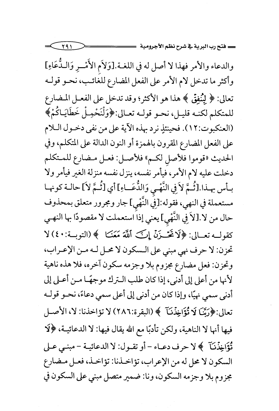 والدعاء والأمر فهذا لا أصل له في اللغة. [وَلاَمِ الأَمْرِ وَالدُّعَاءِ] وأكثر ما تدخل لام الأمر على الفعل المضارع للغائب، نحو: لينفق: هذا هو الأكثر؛ وقد تدخل على الفعل المضارع للمتكلم لكنه قليل، نحو: {وَلْنَحْمِلْ خَطَايَاكُمْ} (العنكبوت:12). فحينئذٍ نرد بهذه الآية على من نفى دخول اللام على الفعل المضارع المقرون بالهمزة أو النون الدالة على المتكلم، وفي الحديث «قوموا فلأصلِ لكم» فلأصل: فعل مضارع للمتكلم دخلت عليه لام الأمر، فيأمر نفسه، ينزل نفسه منزلة الغير فيأمر ولا بأس بهذا. [ثُمَّ لاَ فِي النَّهْيِ وَالدُّعَاءِ] أي [ثُمَّ لاَ] حالة كونها مستعملة في النهي، فقوله: [فِي النَّهْيِ] جار ومجرور متعلق بمحذوف حال من لا.