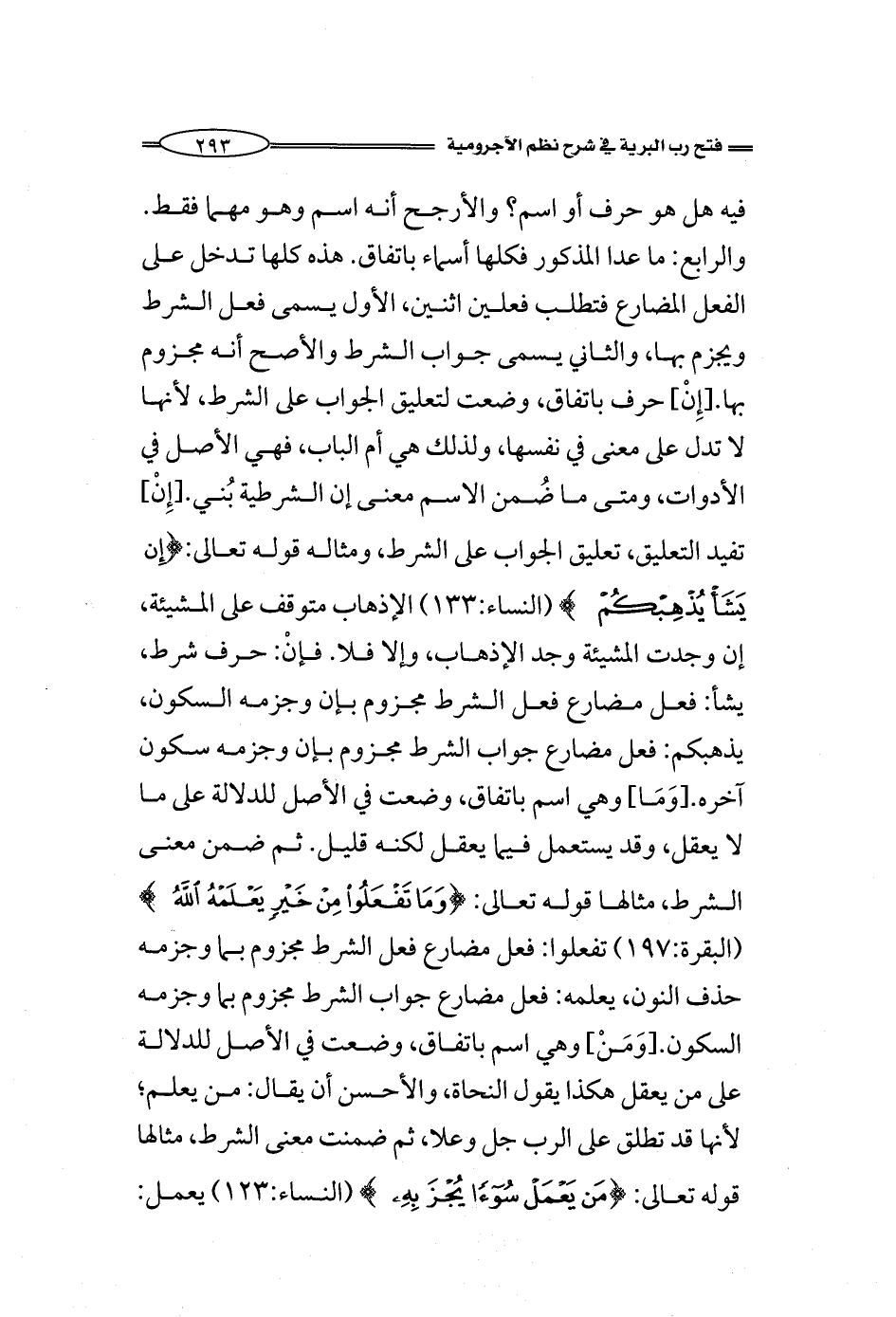 فيه هل هو حرف أو اسم؟ والأرجح أنه اسم وهو مهما فقط. والرابع: ما عدا المذكور فكلها أسماء باتفاق. هذه كلها تدخل على الفعل المضارع فتطلب فعلين اثنين، الأول يسمى فعل الشرط ويجزم بها، والثاني يسمى جواب الشرط والأصح أنه مجزوم بها. [إِنْ] حرف باتفاق، وضعت لتعليق الجواب على الشرط، لأنها لا تدل على معنى في نفسها، ولذلك هي أم الباب، فهي الأصل في الأدوات، ومتى ما ضُمن الاسم معنى إن الشرطية بُني. [إِنْ] تفيد التعليق, تعليق الجواب على الشرط، ومثاله: {إِنْ يَشَأْ يُذْهِبْكُمْ} (النساء:133) الإذهاب متوقف على المشيئة، إن وجدت المشيئة وجد الإذهاب، وإلا فلا. فإنْ: حرف شرط، يشأ: فعل مضارع فعل الشرط مجزوم بإن وجزمه السكون، يذهبكم: فعل مضارع جواب الشرط مجزوم بإن وجزمه سكون آخره. [وَمَا] وهي اسم باتفاق، وضعت في الأصل للدلالة على ما لا يعقل، وقد يستعمل فيما يعقل لكنه قليل. ثم ضمن معنى الشرط، مثالها قوله تعالى: {وَمَا تَفْعَلُوا مِنْ خَيْرٍ يَعْلَمْهُ اللَّهُ} (البقرة:197) تفعلوا: فعل مضارع فعل الشرط مجزوم بما وجزمه حذف النون، يعلمه: فعل مضارع جواب الشرط مجزوم بما وجزمه السكون. [وَمَنْ] وهي اسم باتفاق، وضعت في الأصل للدلالة على من يعقل هكذا يقول النحاة، والأحسن أن يقال: من يعلم؛ لأنها قد تطلق على الرب جل وعلا، ثم ضمنت معنى الشرط، مثالها قوله تعالى: {مَنْ يَعْمَلْ سُوءاً يُجْزَ بِهِ} (النساء:123) يعمل: