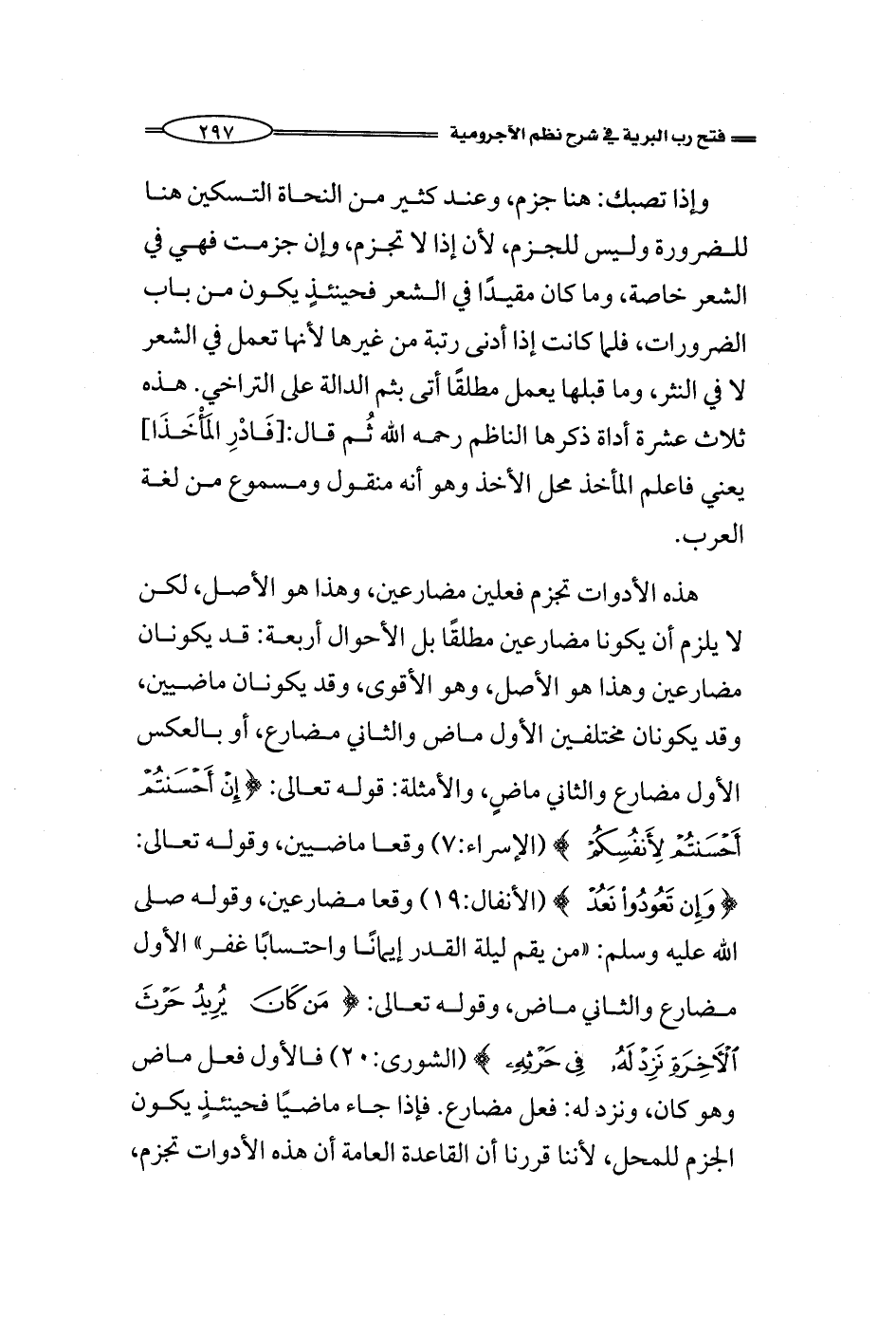 هذه الأدوات تجزم فعلين مضارعين، وهذا هو الأصل، لكن لا يلزم أن يكونا مضارعين مطلقًا بل الأحوال أربعة: قد يكونان مضارعين وهذا هو الأصل، وهو الأقوى، وقد يكونان ماضيين، وقد يكونان مختلفين الأول ماض والثاني مضارع، أو بالعكس الأول مضارع والثاني ماضٍ، والأمثلة: قوله تعالى: {إِنْ أَحْسَنْتُمْ أَحْسَنْتُمْ لَأَنْفُسِكُمْ} (الإسراء:7) إن أحسنتم أحسنتم: إذًا وقعا ماضيين، وقوله تعالى: {وَإِنْ تَعُودُوا نَعُدْ} (الأنفال:19) وقعا مضارعين، وقوله صلى الله عليه وسلم: «من يقم ليلة القدر إيمانًا واحتسابًا غفر» الأول مضارع والثاني ماض، وقوله تعالى: {مَنْ كَانَ يُرِيدُ حَرْثَ الْآخِرَةِ نَزِدْ لَهُ فِي حَرْثِهِ} (الشورى:20) فالأول فعل ماض وهو كان، ونزد له: فعل مضارع. فإذا جاء ماضيًا فحينئذٍ يكون الجزم للمحل، لأننا قررنا أن القاعدة العامة أن هذه الأدوات تجزم،