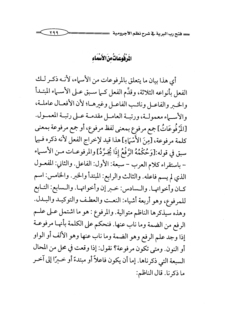 أي هذا بيان ما يتعلق بالمرفوعات من الأسماء، لأنه ذكر لك الفعل بأنواعه الثلاثة، وقدَّم الفعل كما سبق على الأسماء المبتدأ والخبر والفاعل ونائب الفاعل وغيرها؛ لأن الأفعال عاملة، والأسماء معمولة، ورتبة العامل مقدمة على رتبة المعمول. [المَرْفُوعَاتُ] جمع مرفوع بمعنى لفظ مرفوع، أو جمع مرفوعة بمعنى كلمة مرفوعة، [مِنَ الأَسْمَاءِ] هذا قيد لإخراج الفعل لأنه ذكره فيما سبق في قوله: [وَحُكْمُهُ الرَّفْعُ إِذَا يُجَرَّدُ] والمرفوعات من الأسماء - باستقراء كلام العرب - سبعة: الأول: الفاعل. والثاني: المفعول الذي لم يسم فاعله. والثالث والرابع: المبتدأ والخبر. والخامس: اسم كان وأخواتها. والسادس: خبر إن وأخواتها. والسابع: التابع للمرفوع، وهو أربعة أشياء: النعت والعطف والتوكيد والبدل. وهذه سيذكرها الناظم متوالية. والمرفوع: هو ما اشتمل على علم الرفع من الضمة وما ناب عنها. فنحكم على الكلمة بأنها مرفوعة إذا وجد علم الرفع وهو الضمة وما ناب عنها وهو الألف أو الواو أو النون. ومتى تكون مرفوعة؟ نقول: إذا وقعت في محل من المحال السبعة التي ذكرناها. إما أن يكون فاعلاً أو مبتدءً أو خبرًا إلى آخر ما ذكرنا. قال الناظم: