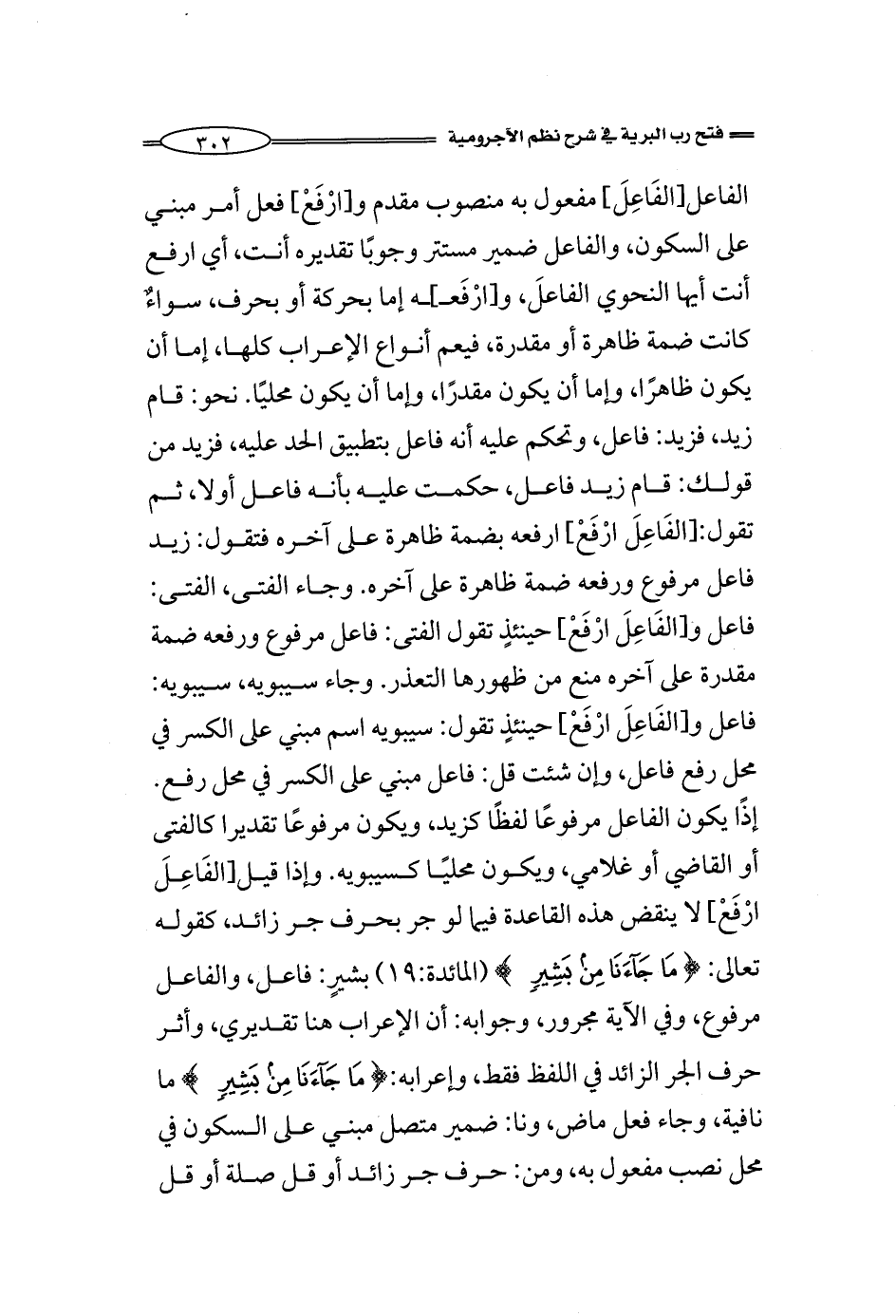 الفاعل [الفَاعِلَ] مفعول به منصوب مقدم و [ارْفَعْ] فعل أمر مبني على السكون، والفاعل ضمير مستتر وجوبًا تقديره أنت، أي ارفع أنت أيها النحوي الفاعلَ، و [ارْفَعـ]ـه إما بحركة أو بحرف، سواءٌ كانت ضمة ظاهرة أو مقدرة، فيعم أنواع الإعراب كلها، إما أن يكون ظاهرًا، وإما أن يكون مقدرًا، وإما أن يكون محليًا. نحو: قام زيد, فزيد: فاعل، وتحكم عليه أنه فاعل بتطبيق الحد عليه، فزيد من قولك: قام زيد فاعل، حكمت عليه بأنه فاعل أولا، ثم تقول: [الفَاعِلَ ارْفَعْ] ارفعه بضمة ظاهرة على آخره فتقول: زيد فاعل مرفوع ورفعه ضمة ظاهرة على آخره. وجاء الفتى، الفتى: فاعل و [الفَاعِلَ ارْفَعْ] حينئذٍ تقول الفتى: فاعل مرفوع ورفعه ضمة مقدرة على آخره منع من ظهورها التعذر. وجاء سيبويه، سيبويه: فاعل و [الفَاعِلَ ارْفَعْ] حينئذٍ تقول: سيبويه اسم مبني على الكسر في محل رفع فاعل، وإن شئت قل: فاعل مبني على الكسر في محل رفع. إذًا يكون الفاعل مرفوعًا لفظًا كزيد، ويكون مرفوعًا تقديرا كالفتى أو القاضي أو غلامي، ويكون محليًا كسيبويه. وإذا قيل [الفَاعِلَ ارْفَعْ] لا ينقض هذه القاعدة فيما لو جر بحرف جر زائد، كقوله تعالى: {مَا جَاءَنَا مِنْ بَشِيرٍ} (المائدة:19) بشيرٍ: فاعل، والفاعل مرفوع، وفي الآية مجرور، وجوابه: أن الإعراب هنا تقديري، وأثر حرف الجر الزائد في اللفظ فقط، وإعرابه: {مَا جَاءَنَا مِنْ بَشِيرٍ} ما نافية، وجاء فعل ماض، ونا: ضمير متصل مبني على السكون في محل نصب مفعول به، ومن: حرف جر زائد أو قل صلة أو قل