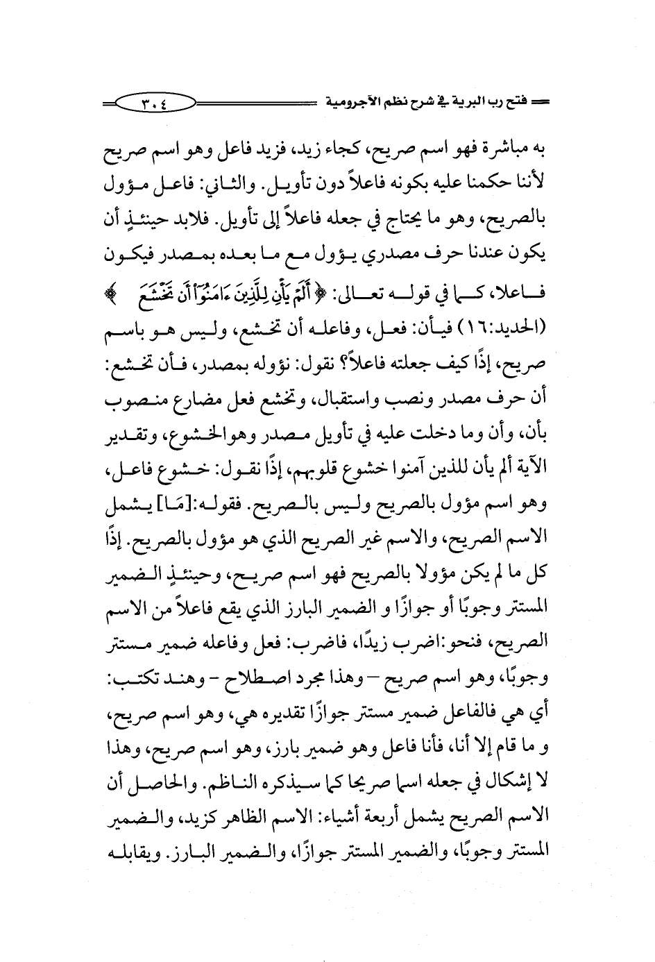 به مباشرة فهو اسم صريح، كجاء زيد، فزيد فاعل وهو اسم صريح لأننا حكمنا عليه بكونه فاعلاً دون تأويل. والثاني: فاعل مؤول بالصريح، وهو ما يحتاج في جعله فاعلاً إلى تأويل. فلابد حينئذٍ أن يكون عندنا حرف مصدري يؤول مع ما بعده بمصدر فيكون فاعلا، كما في قوله تعالى: {أَلَمْ يَأْنِ لِلَّذِينَ آمَنُوا أَنْ تَخْشَعَ} (الحديد:16) فيأن: فعل، وفاعله أن تخشع، وليس هو باسم صريح، إذًا كيف جعلته فاعلاً؟ نقول: نؤوله بمصدر، فأن تخشع: أن حرف مصدر ونصب واستقبال، وتخشع فعل مضارع منصوب بأن، وأن وما دخلت عليه في تأويل مصدر وهوالخشوع، وتقدير الآية ألم يأن للذين آمنوا خشوع قلوبهم، إذًا نقول: خشوع فاعل، وهو اسم مؤول بالصريح وليس بالصريح. فقوله: [مَا] يشمل الاسم الصريح، والاسم غير الصريح الذي هو مؤول بالصريح. إذًا كل ما لم يكن مؤولا بالصريح فهو اسم صريح، وحينئذٍ الضمير المستتر وجوبًا أو جوازًا والضمير البارز الذي يقع فاعلاً من الاسم الصريح، فنحو: اضرب زيدًا، فاضرب: فعل وفاعله ضمير مستتر وجوبًا، وهو اسم صريح - وهذا مجرد اصطلاح - وهند تكتب: أي هي فالفاعل ضمير مستتر جوازًا تقديره هي، وهو اسم صريح، وما قام إلا أنا، فأنا فاعل وهو ضمير بارز، وهو اسم صريح، وهذا لا إشكال في جعله اسما صريحا كما سيذكره الناظم. والحاصل أن الاسم الصريح يشمل أربعة أشياء: الاسم الظاهر كزيد، والضمير المستتر وجوبًا، والضمير المستتر جوازًا، والضمير البارز. ويقابله