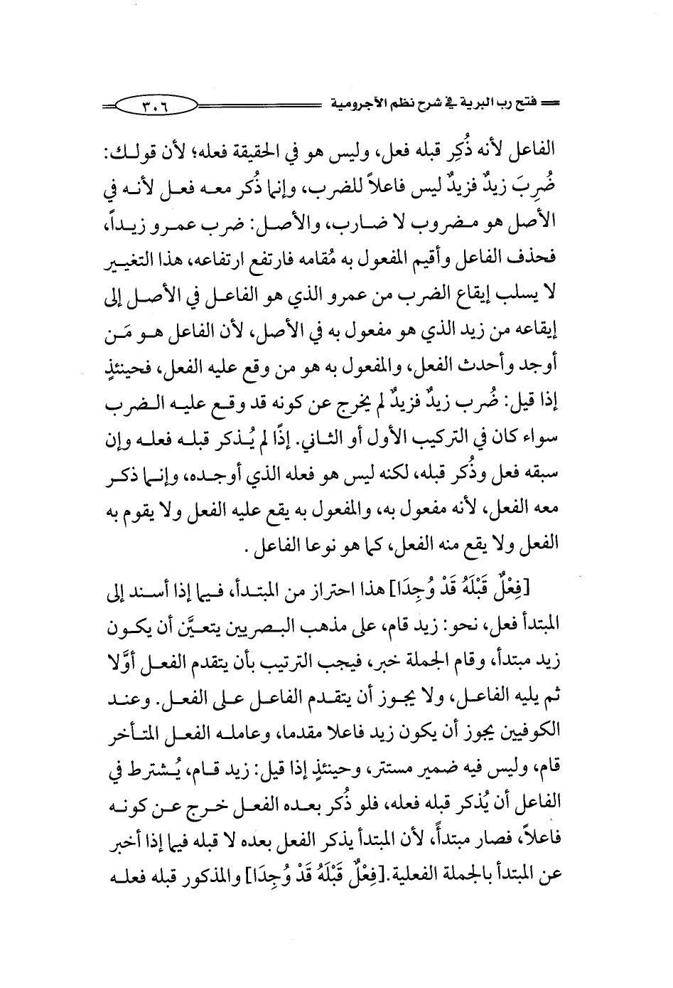 [فِعْلٌ قَبْلَهُ قَدْ وُجِدَا] هذا احتراز من المبتدأ، فيما إذا أسند إلى المبتدأ فعل، نحو: زيد قام، على مذهب البصريين يتعيَّن أن يكون زيد مبتدأ، وقام الجملة خبر، فيجب الترتيب بأن يتقدم الفعل أوَّلا ثم يليه الفاعل، ولا يجوز أن يتقدم الفاعل على الفعل. وعند الكوفيين يجوز أن يكون زيد فاعلا مقدما، وعامله الفعل المتأخر قام، وليس فيه ضمير مستتر، وحينئذٍ إذا قيل: زيد قام، يُشترط في الفاعل أن يُذكر قبله فعله، فلو ذُكر بعده الفعل خرج عن كونه فاعلاً، فصار مبتدأً، لأن المبتدأ يذكر الفعل بعده لا قبله فيما إذا أخبر عن المبتدأ بالجملة الفعلية. [فِعْلٌ قَبْلَهُ قَدْ وُجِدَا] والمذكور قبله فعله