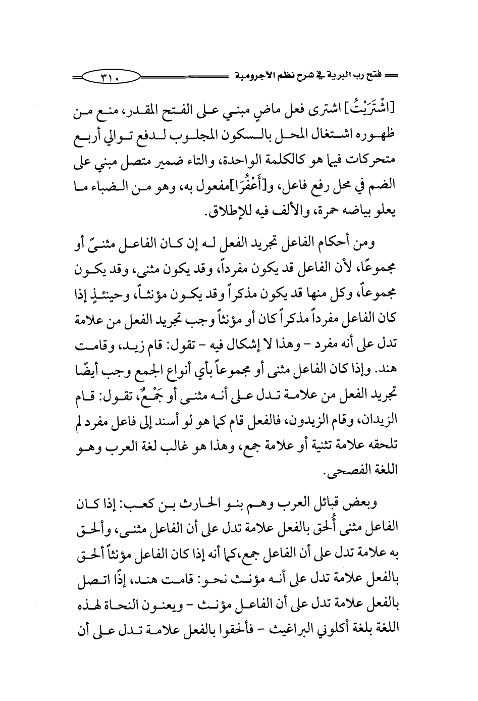 ومن أحكام الفاعل تجريد الفعل له إن كان الفاعل مثنىً أو مجموعًا، لأن الفاعل قد يكون مفرداً، وقد يكون مثنى، وقد يكون مجموعاً، وكل منها قد يكون مذكراً وقد يكون مؤنثاً، وحينئذٍ إذا كان الفاعل مفرداً مذكراً كان أو مؤنثاً وجب تجريد الفعل من علامة تدل على أنه مفرد - وهذا لا إشكال فيه - تقول: قام زيد، وقامت هند. وإذا كان الفاعل مثنى أو مجموعاً بأي أنواع الجمع وجب أيضًا تجريد الفعل من علامة تدل على أنه مثنى أو جمعٌ، نقول: قام الزيدان، وقام الزيدون، فالفعل قام كما هو لو أسند إلى فاعل مفرد لم تلحقه علامة تثنية أو علامة جمع، وهذا هو غالب لغة العرب وهو اللغة الفصحى.