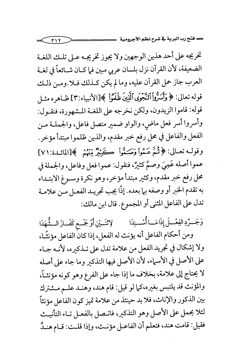 تخريجه على أحد هذين الوجهين ولا يجوز تخريجه على تلك اللغة الضعيفة، لأن القرآن نزل بلسان عربي مبين فما كان شائعاً في لغة العرب جاز حمل القرآن عليه، وما لم يكن كذلك فلا. ومن ذلك قوله تعالى: (وََأَسَرُّوا النَّجْوَى الَّذِينَ ظَلَمُوا) [الأنبياء:3] ظاهره مثل قوله: قاموا الزيدون، ولكن نخرجه على اللغة المشهورة، فنقول: وأسروا أسر فعل ماضٍ، والواو ضمير متصل فاعل، والجملة من الفعل والفاعل في محل رفع خبر مقدم، والذين ظلموا مبتدأ مؤخر. وقوله تعالى: (ثُمَّ عَمُوا وَصَمُّوا كَثِيرٌ) [المائدة:71] عموا أصله عَمِيَ وصمَّ كثيرٌ، فنقول: عموا فعل وفاعل، والجملة في محل رفع خبر مقدم، وكثير مبتدأ مؤخر، وهو نكرة وسوغ الابتداء به تقدم الخبر. إذًا يجب تجريد الفعل من علامة تدل على الفاعل المثنى أو المجموع. قال ابن مالك: