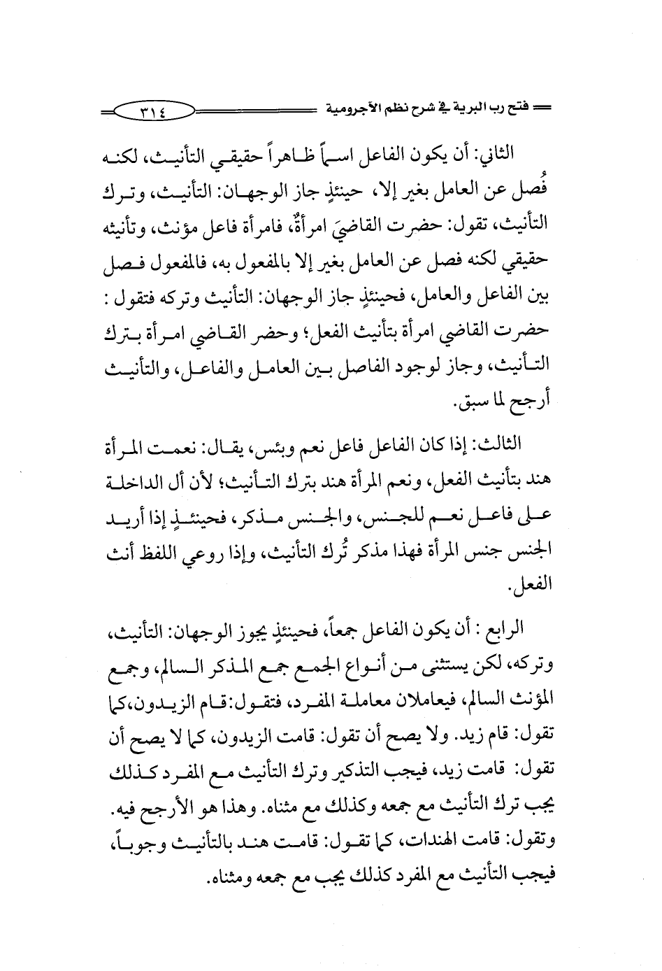 الرابع: أن يكون الفاعل جمعاً، حينئذٍ يجوز الوجهان: التأنيث، وتركه، لكن يستثنى من أنواع الجمع جمع المذكر السالم، وجمع المؤنث السالم، فيعاملان معاملة المفرد، فتقول: قام الزيدون، كما تقول: قام زيد. ولا يصح أن تقول: قامت الزيدون، كما لا يصح أن تقول: قامت زيد، فيجب التذكير وترك التأنيث مع المفرد كذلك يجب ترك التأنيث مع جمعه وكذلك مع مثناه. وهذا هو الأرجح فيه. وتقول: قامت الهندات، كما تقول: قامت هند بالتأنيث وجوباً، فيجب التأنيث مع المفرد كذلك يجب مع جمعه ومثناه.