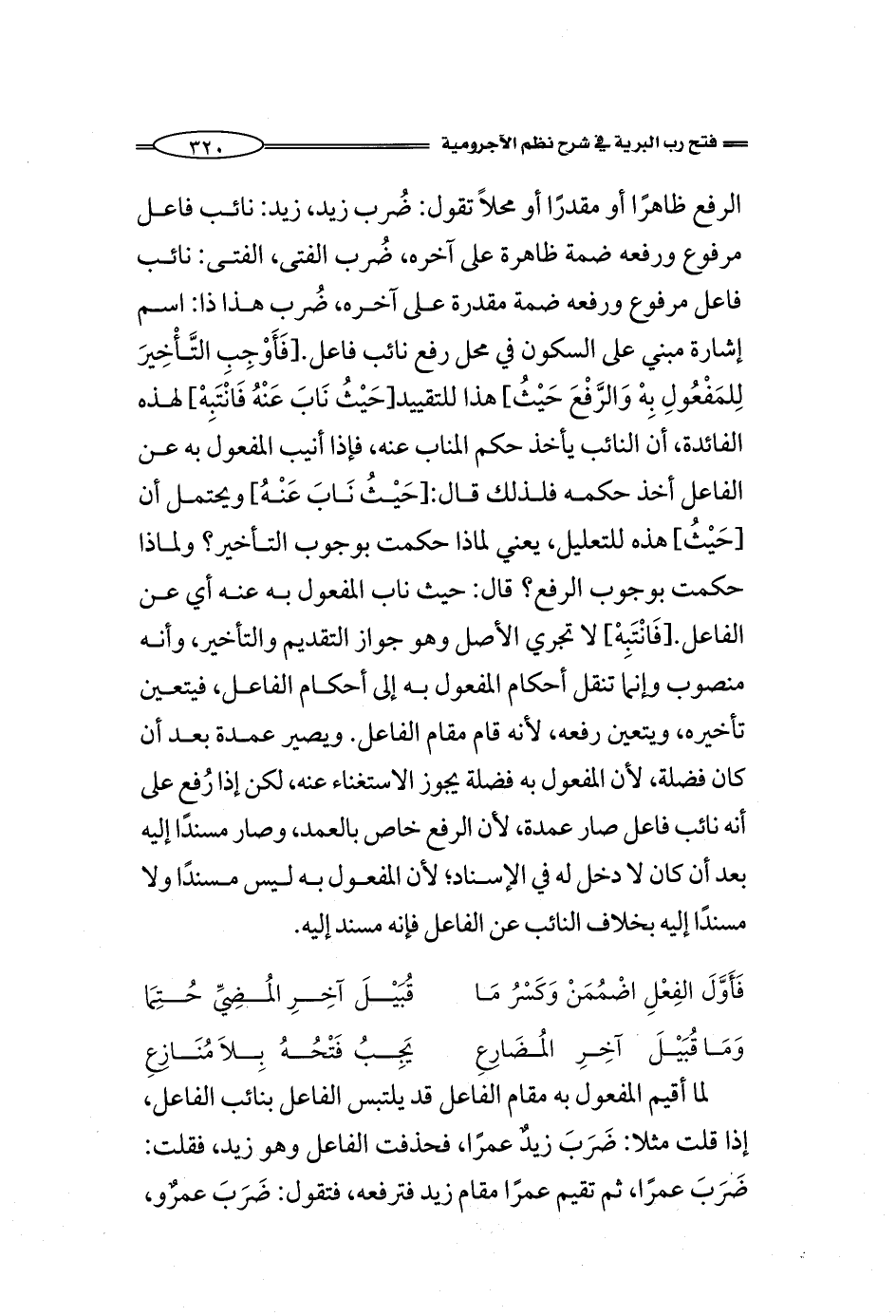[فَأَوْجِبِ التَّأْخِيرَ لِلمَفْعُولِ بِهْ وَالرَّفْعَ حَيْثُ] هذا للتقييد [حَيْثُ نَابَ عَنْهُ فَانْتَبِهْ] لهذه الفائدة، أن النائب يأخذ حكم المناب عنه، فإذا أنيب المفعول به عن الفاعل أخذ حكمه فلذلك قال: [حَيْثُ نَابَ عَنْهُ] ويحتمل أن [حَيْثُ] هذه للتعليل، يعني لماذا حكمت بوجوب التأخير؟ ولماذا حكمت بوجوب الرفع؟ قال: حيث ناب المفعول به عنه أي عن الفاعل. [فَانْتَبِهْ] لا تجري الأصل وهو جواز التقديم والتأخير، وأنه منصوب وإنما تنقل أحكام المفعول به إلى أحكام الفاعل، فيتعين تأخيره، ويتعين رفعه، لأنه قام مقام الفاعل. ويصير عمدة بعد أن كان فضلة، لأن المفعول به فضلة يجوز الاستغناء عنه، لكن إذا رُفع على أنه نائب فاعل صار عمدة، لأن الرفع خاص بالعمد، وصار مسندًا إليه بعد أن كان لا دخل له في الإسناد؛ لأن المفعول به ليس مسندًا ولا مسندًا إليه بخلاف النائب عن الفاعل فإنه مسند إليه.