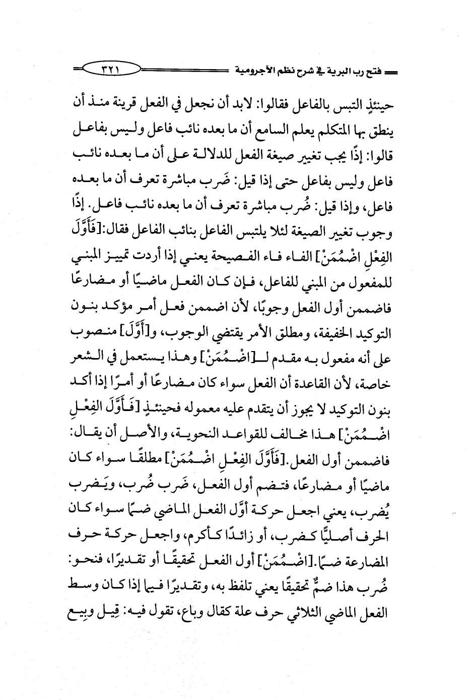 حينئذٍ التبس بالفاعل فقالوا: لابد أن نجعل في الفعل قرينة منذ أن ينطق بها المتكلم يعلم السامع أن ما بعده نائب فاعل وليس بفاعل قالوا: إذًا يجب تغيير صيغة الفعل للدلالة على أن ما بعده نائب فاعل وليس بفاعل حتى إذا قيل: ضَرب مباشرة تعرف أن ما بعده فاعل، وإذا قيل: ضُرب مباشرة تعرف أن ما بعده نائب فاعل. إذًا وجوب تغيير الصيغة لئلا يلتبس الفاعل بنائب الفاعل فقال: [فَأَوَّلَ الفِعْلِ اضْمُمَنْ] الفاء فاء الفصيحة يعني إذا أردت تمييز المبني للمفعول من المبني للفاعل، فإن كان الفعل ماضيًا أو مضارعًا فاضممن أول الفعل وجوبًا، لأن اضممن فعل أمر مؤكد بنون التوكيد الخفيفة، ومطلق الأمر يقتضي الوجوب، و [أَوَّلَ] منصوب على أنه مفعول به مقدم لـ[اضْمُمَنْ] وهذا يستعمل في الشعر خاصة، لأن القاعدة أن الفعل سواء كان مضارعًا أو أمرًا إذا أكد بنون التوكيد لا يجوز أن يتقدم عليه معموله فحينئذٍ [فَأَوَّلَ الفِعْلِ اضْمُمَنْ] هذا مخالف للقواعد النحوية، والأصل أن يقال: فاضممن أول الفعل. [فَأَوَّلَ الفِعْلِ اضْمُمَنْ] مطلقًا سواء كان ماضيًا أو مضارعًا، فتضم أول الفعل، ضَرب ضُرب، ويَضرب يُضرب، يعني اجعل حركة أوَّل الفعل الماضي ضمًا سواء كان الحرف أصليًّا كضرب، أو زائدًا كأكرم، واجعل حركة حرف المضارعة ضمًا. [اضْمُمَنْ] أول الفعل تحقيقًا أو تقديرًا، فنحو: ضُرب هذا ضمٌّ تحقيقًا يعني تلفظ به، وتقديرًا فيما إذا كان وسط الفعل الماضي الثلاثي حرف علة كقال وباع، فقال تقول فيه: قِيل