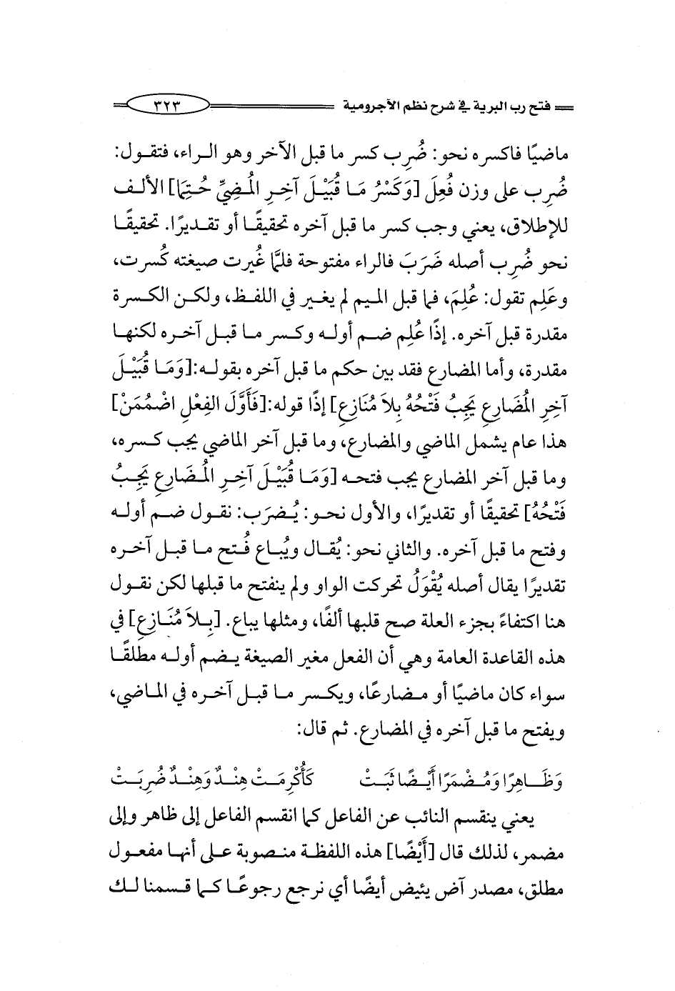 ماضيًا فاكسره نحو: ضُرِب كسر ما قبل الآخر وهو الراء، فتقول: ضُرِب على وزن فُعِلَ [وَكَسْرُ مَا قُبَيْلَ آخِرِ المُضِيِّ حُتِمَا] الألف للإطلاق، يعني وجب كسر ما قبل آخره تحقيقًا أو تقديرًا. تحقيقًا نحو ضُرِب أصله ضَرَبَ فالراء مفتوحة فلمَّا غُيرت صيغته كُسرت، وعَلِم تقول: عُلِمَ، فما قبل الميم لم يغير في اللفظ، ولكن الكسرة مقدرة قبل آخره. إذًا عُلِم ضم أوله وكسر ما قبل آخره لكنها مقدرة، وأما المضارع فقد بين حكم ما قبل آخره بقوله: [وَمَا قُبَيْلَ آخِرِ المُضَارِعِ يَجِبُ فَتْحُهُ بِلاَ مُنَازِعِ] إذًا قوله: [فَأَوَّلَ الفِعْلِ اضْمُمَنْ] هذا عام يشمل الماضي والمضارع، وما قبل آخر الماضي يجب كسره، وما قبل آخر المضارع يجب فتحه [وَمَا قُبَيْلَ آخِرِ المُضَارِعِ يَجِبُ فَتْحُهُ] تحقيقًا أو تقديرًا، والأول نحو: يُضرَب: نقول ضم أوله وفتح ما قبل آخره. والثاني نحو: يُقال ويُباع فُتح ما قبل آخره تقديرًا يقال أصله يُقْوَلُ تحركت الواو ولم ينفتح ما قبلها لكن نقول هنا اكتفاء بجزء العلة صح قلبها ألفًا، ومثلها يباع. [بِلاَ مُنَازِعِ] في هذه القاعدة العامة وهي أن الفعل مغير الصيغة يضم أوله مطلقًا سواء كان ماضيًا أو مضارعًا، ويكسر ما قبل آخره في الماضي، ويفتح ما قبل آخره في المضارع. ثم قال: