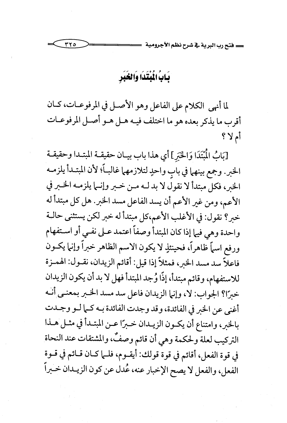 [بَابُ المُبْتَدَا وَالخَبَرِ] أي هذا باب بيان حقيقة المبتدا وحقيقة الخبر. وجمع بينهما في بابٍ واحدٍ لتلازمهما غالباً؛ لأن المبتدأ يلزمه الخبر، فكل مبتدأ لا نقول لا بد له من خبر وإنما يلزمه الخبر في الأعم، ومن غير الأعم أن يسد الفاعل مسد الخبر. هل كل مبتدأ له خبر؟ نقول: في الأغلب الأعم، كل مبتدأ له خبر لكن يستثنى حالة واحدة وهي فيما إذا كان المبتدأ وصفاً اعتمد على نفي أو استفهام ورفع اسماً ظاهراً، فحينئذٍ لا يكون الاسم الظاهر خبراً وإنما يكون فاعلاً سد مسد الخبر، فمثلاً إذا قيل: أقائم الزيدان، نقول: الهمزة للاستفهام، وقائم مبتدأ، إذًا وُجد المبتدأ فهل لا بد أن يكون الزيدان خبرًا؟ الجواب: لا، وإنما الزيدان فاعل سد مسد الخبر بمعنى أنه أغنى عن الخبر في الفائدة، وقد وجدت الفائدة به كما لو وجدت بالخبر، وامتناع أن يكون الزيدان خبرًا عن المبتدأ في مثل هذا التركيب لعلة ولحكمة وهي أن قائم وصفٌ، والمشتقات عند النحاة في قوة الفعل، أقائم في قوة قولك: أيقوم، فلما كان قائم في قوة الفعل، والفعل لا يصح الإخبار عنه، عُدل عن كون الزيدان خبراً