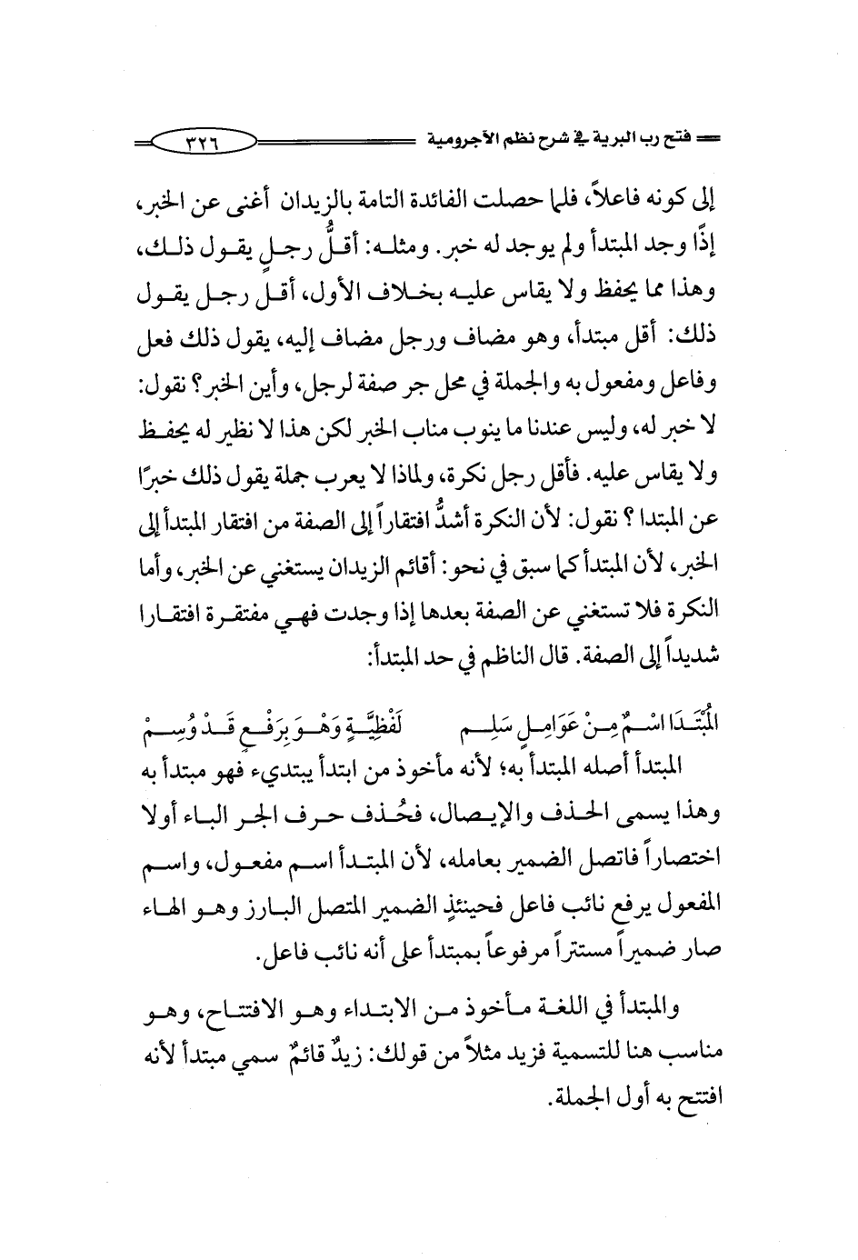 إلى كونه فاعلاً، فلما حصلت الفائدة التامة بالزيدان أغنى عن الخبر، إذًا وجد المبتدأ ولم يوجد له خبر. ومثله: أقلُّ رجلٍ يقول ذلك، وهذا مما يحفظ ولا يقاس عليه بخلاف الأول، أقل رجل يقول ذلك: أقل مبتدأ، وهو مضاف ورجل مضاف إليه، يقول ذلك فعل وفاعل ومفعول به والجملة في محل جر صفة لرجل، وأين الخبر؟ نقول: لا خبر له، وليس عندنا ما ينوب مناب الخبر لكن هذا لا نظير له يحفظ ولا يقاس عليه. فأقل رجل نكرة، ولماذا لا يعرب جملة يقول ذلك خبرًا عن المبتدإ؟ نقول: لأن النكرة أشدُّ افتقاراً إلى الصفة من افتقار المبتدأ إلى الخبر، لأن المبتدأ كما سبق في نحو: أقائم الزيدان يستغني عن الخبر، أما النكرة فلا تستغني عن الصفة بعدها إذا وجدت فهي مفتقرة افتقارا شديداً إلى الصفة. قال الناظم في حد المبتدأ: