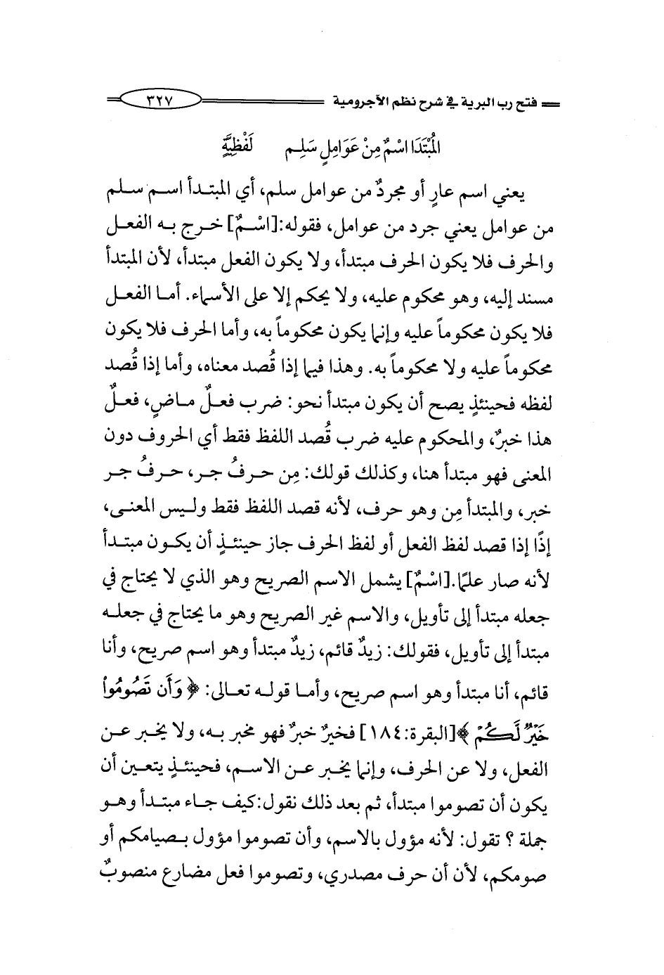 يعني اسم عارٍ أو مجردٌ من عوامل سلم، أي المبتدأ اسم سلم من عوامل يعني جرد من عوامل، فقوله: [اسْمٌ] خرج به الفعل والحرف فلا يكون الحرف مبتدأ، ولا يكون الفعل مبتدأ، لأن المبتدأ مسند إليه، وهو محكوم عليه، ولا يحكم إلا على الأسماء. أما الفعل فلا يكون محكوماً عليه وإنما يكون محكوماً به، وأما الحرف فلا يكون محكوماً عليه ولا محكوماً به. وهذا فيما إذا قُصد معناه، أما إذا قُصد لفظه فحينئذٍ يصح أن يكون مبتدأ نحو: ضرب فعلٌ ماضٍ، فعلٌ هذا خبرٌ، والمحكوم عليه ضرب قُصد اللفظ فقط أي الحروف دون المعنى فهو مبتدأ هنا، وكذلك قولك: مِن حرفُ جر، حرفُ جر خبر، والمبتدأ مِن وهو حرف، لأنه قصد اللفظ فقط وليس المعنى، إذًا إذا قصد لفظ الفعل أو لفظ الحرف جاز حينئذٍ أن يكون مبتدأ. [اسْمٌ] يشمل الاسم الصريح وهو الذي لا يحتاج في جعله مبتدأ إلى تأويل، والاسم غير الصريح وهو ما يحتاج في جعله مبتدأ إلى تأويل، فقولك: زيدٌ قائم، زيدٌ مبتدأ وهو اسم صريح، وأنا قائم، أنا مبتدأ وهو اسم صريح، وأما قوله تعالى: (وَأَنْ تَصُومُوا خَيْرٌ لَكُمْ) [البقرة:184] خيرٌ خبرٌ فهو مخبر به، ولا يخبر عن الفعل، ولا عن الحرف، وإنما يخبر عن الاسم، فحينئذٍ يتعين أن يكون أن تصوموا مبتدأ، ثم بعد ذلك نقول: كيف جاء مبتدأ وهو جملة؟ تقول: لأنه مؤول بالاسم، وأن تصوموا مؤول بصيامكم أو صومكم، لأن أن حرف مصدري، وتصوموا فعل مضارع منصوبٌ