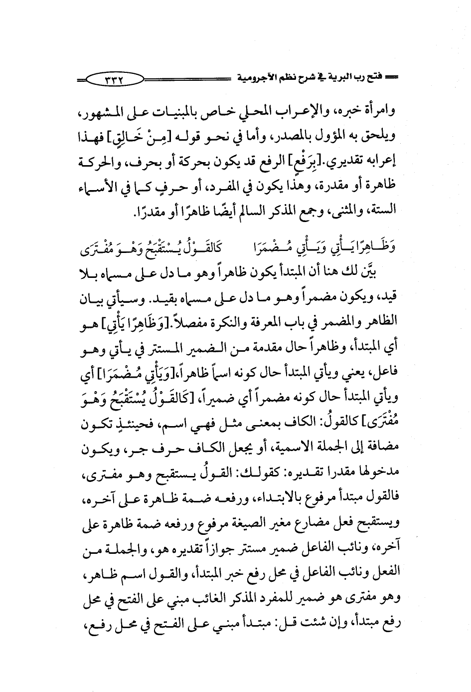 بيَّن لك هنا أن المبتدأ يكون ظاهراً وهو ما دل على مسماه بلا قيد، ويكون مضمراً وهو ما دل على مسماه بقيد. وسيأتي بيان الظاهر والمضمر في باب المعرفة والنكرة مفصلاً. [وَظَاهِرًا يَأْتِي] هو أي المبتدأ، وظاهراً حال مقدمة من الضمير المستتر في يأتي وهو فاعل، يعني ويأتي المبتدأ حال كونه اسماً ظاهراً، [وَيَأْتِي مُضْمَرَا] أي ويأتي المبتدأ حال كونه مضمراً أي ضميراً، [كَالقَوْلُ يُسْتَقْبَحُ وَهْوَ مُفْتَرَى] كالقولُ: الكاف بمعنى مثل فهي اسم، فحينئذٍ تكون مضافة إلى الجملة الاسمية، أو يجعل الكاف حرف جر، ويكون مدخولها مقدرا تقديره: كقولك: القولُ يستقبح وهو مفترى، فالقول مبتدأ مرفوع بالابتداء، ورفعه ضمة ظاهرة على آخره، ويستقبح فعل مضارع مغير الصيغة مرفوع ورفعه ضمة ظاهرة على آخره، ونائب الفاعل ضمير مستتر جوازاً تقديره هو، والجملة من الفعل ونائب الفاعل في محل رفع خبر المبتدأ، والقول اسم ظاهر، وهو مفترى هو ضمير للمفرد المذكر الغائب مبني على الفتح في محل رفع مبتدأ، وإن شئت قل: مبتدأ مبني على الفتح في محل رفع،