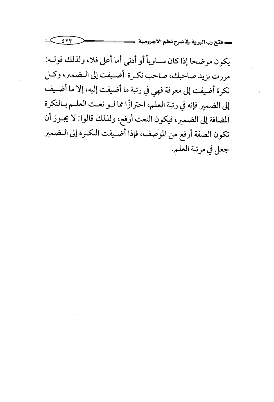 يكون موضحا إذا كان مساوياً أو أدنى أما أعلى فلا، ولذلك مررت بزيد صاحبك، صاحب نكرة أضيفت إلى الضمير، وكل نكرة أضيفت إلى معرفة فهي في رتبة ما أضيفت إليه، إلا ما أضيف إلى الضمير فإنه في رتبة العلم، احترازًا مما لو نعت العلم بالنكرة المضافة إلى الضمير، فيكون النعت أرفع، ولذلك قالوا: لا يجوز أن تكون الصفة أرفع من الموصف، فإذا أضيفت النكرة إلى الضمير جعل في مرتبة العلم.