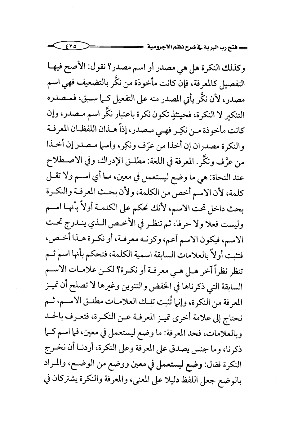 وكذلك النكرة هل هي مصدر أو اسم مصدر؟ نقول: الأصح فيها التفصيل كالمعرفة، فإن كانت مأخوذة من نكَّر بالتضعيف فهي اسم مصدر، لأن نكَّر يأتي المصدر منه على التفعيل كما سبق، فمصدره التنكير لا النكرة، فحينئذٍ تكون نكرة باعتبار نكَّر اسم مصدر، وإن كانت مأخوذة من نكِر فهي مصدر، إذاً هذان اللفظان المعرفة والنكرة مصدران إن أخذا من عرَف ونكِر، واسما مصدر إن أخذا من عرَّف ونكَّر. المعرفة في اللغة: مطلق الإدراك، وفي الاصطلاح عند النحاة: هي ما وضع ليستعمل في معين، ما أي اسم ولا تقل كلمة، لأن الاسم أخص من الكلمة، ولأن بحث المعرفة والنكرة بحث داخل تحت الاسم، لأنك تحكم على الكلمة أولاً بأنها اسم وليست فعلا ولا حرفا، ثم تنظر في الأخص الذي يندرج تحت الاسم، فيكون الاسم أعم، وكونه معرفة، أو نكرة هذا أخص، فتثبت أولاً بالعلامات السابقة اسمية الكلمة، فتحكم بأنها اسم ثم تنظر نظراً آخر هل هي معرفة أو نكرة؟ لكن علامات الاسم السابقة التي ذكرناها في الخفض والتنوين وغيرها لا تصلح أن تميز المعرفة من النكرة، وإنما تُثبت تلك العلامات مطلق الاسم، ثم نحتاج إلى علامة أخرى تميز المعرفة عن النكرة، فتعرف بالحد وبالعلامات، فحد المعرفة: ما وضع ليستعمل في معين، فما اسم كما ذكرنا، وما جنس يصدق على المعرفة وعلى النكرة، أردنا أن نخرج النكرة فقال: وضع ليستعمل في معين ووضع من الوضع، والمراد بالوضع جعل اللفظ دليلا على المعنى، النكرة والمعرفة يشتركان في