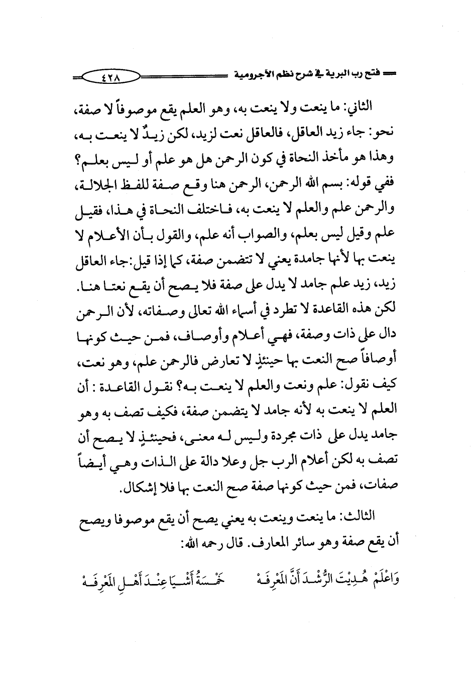الثاني: ما ينعت ولا ينعت به، وهو العلم يقع موصوفاً لا صفة، نحو: جاء زيد العاقل، فالعاقل نعت لزيد، لكن لا ينعت به، وهذا هو مأخذ النحاة في كون الرحمن هل هو علم أو ليس بعلم؟ ففي قوله: بسم الله الرحمن، الرحمن هنا وقع صفة للفظ الجلالة، والرحمن علم والعلم لا ينعت به، فاختلف النحاة في هذا، فقيل علم وقيل ليس بعلم، والصواب أنه علم، والقول بأن الأعلام لا ينعت بها لأنها جامدة يعني لا تتضمن صفة، إذا قيل: جاء العاقل زيد، زيد علم جامد لا يدل على صفة فلا يصح أن يقع نعتا هنا. لكن هذه القاعدة لا تطرد في أسماء الله تعالى وصفاته، لأن الرحمن دال على ذات وصفة، فهي أعلام وأوصاف، فمن حيث كونها أوصافاً صح النعت بها حينئذٍ لا تعارض فالرحمن علم، وهو نعت، كيف نقول: علم ونعت والعلم لا ينعت به؟ نقول القاعدة: أن العلم لا ينعت به لأنه جامد لا يتضمن صفة، كيف تصف به وهو جامد يدل على ذات مجردة وليس له معنى، حينئذٍ لا يصح أن تصف به لكن أعلام الرب جل وعلا دالة على الذات وهي أيضاً صفات، فمن حيث كونها صفة صح النعت بها فلا إشكال.