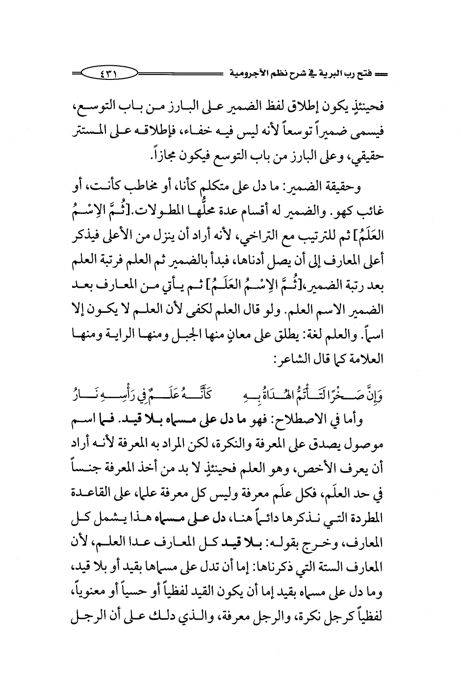 وحقيقة الضمير: ما دل على متكلم كأنا، أو مخاطب كأنت، أو غائب كهو. والضمير له أقسام عدة تأتيكم في المطولات. [ثُمَّ الاِسْمُ العَلَمُ] ثم للترتيب مع التراخي، لأنه أراد أن ينزل من الأعلى فيذكر أعلى المعارف إلى أن يصل أدناها، فبدأ بالضمير ثم العلم فرتبة العلم بعد رتبة الضمير، [ثُمَّ الاِسْمُ العَلَمُ] ثم يأتي من المعارف بعد الضمير الاسم العلم. ولو قال العلم لكفى لأن العلم لا يكون إلا اسماً. والعلم لغة: يطلق على معانٍ منها الجبل ومنها الراية ومنها العلامة