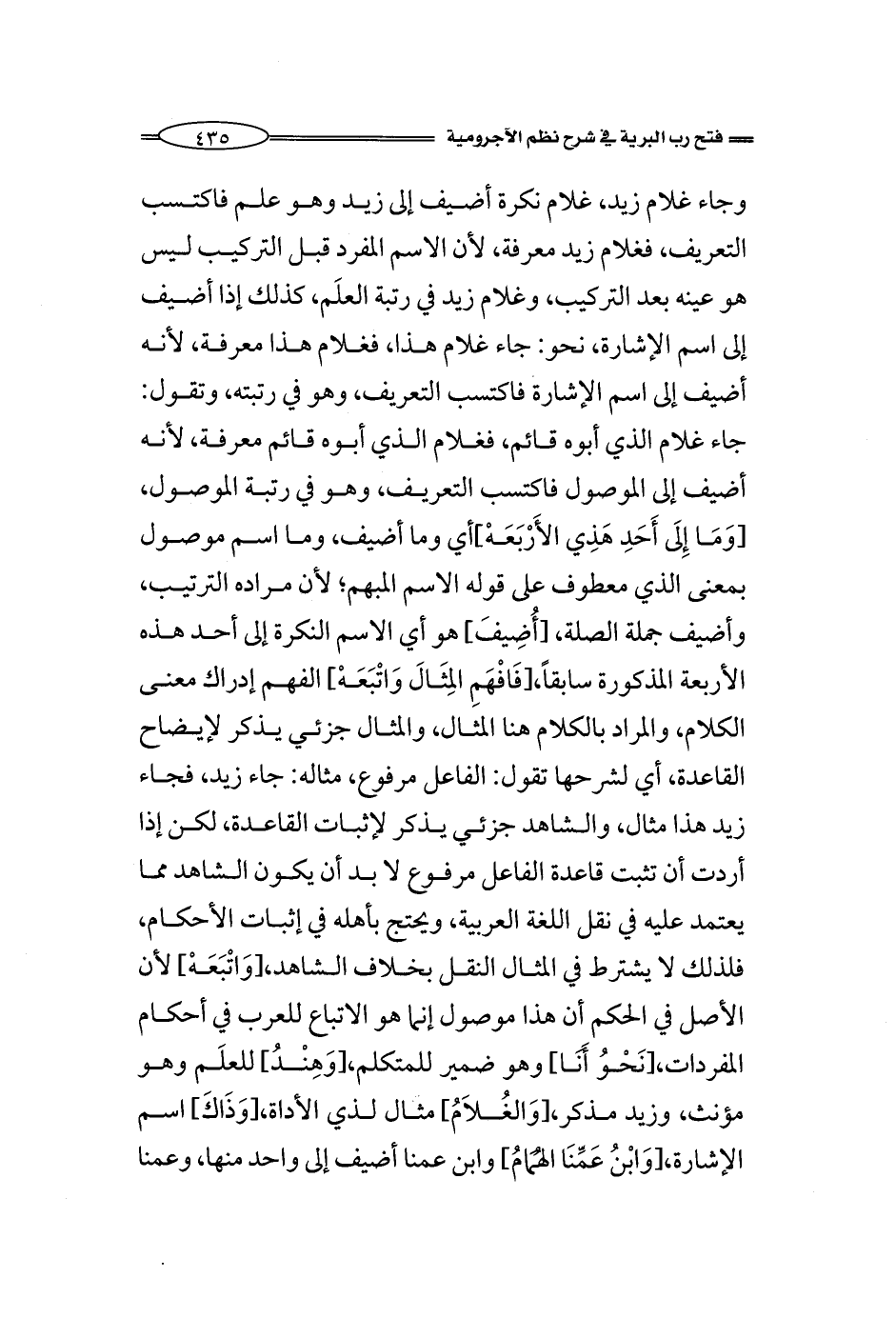 وجاء غلام زيد، غلام نكرة أضيف إلى زيد وهو علم فاكتسب التعريف، فغلام زيد معرفة، لأن الاسم المفرد قبل التركيب ليس هو عينه بعد التركيب، وغلام زيد في رتبة العلَم، كذلك إذا أضيف إلى اسم الإشارة، نحو: جاء غلام هذا، فغلام هذا معرفة، لأنه أضيف إلى اسم الإشارة فاكتسب التعريف، وهو في رتبته، وتقول: جاء غلام الذي أبوه قائم، فغلام الذي أبوه قائم معرفة، لأنه أضيف إلى الموصول فاكتسب التعريف، وهو في رتبة الموصول، [وَمَا إِلَى أَحَدِ هَذِي الأَرْبَعَهْ] أي وما أضيف، وما اسم موصول بمعنى الذي معطوف على قوله الاسم المبهم؛ لأن مراده الترتيب، وأضيف جملة الصلة، [أُضِيفَ] هو أي الاسم النكرة إلى أحد هذه الأربعة المذكورة سابقاً، [فَافْهَمِ المِثَالَ وَاتْبَعَهْ] الفهم إدراك معنى الكلام، والمراد بالكلام هنا المثال، والمثال جزئيٌّ يذكر لإيضاح القاعدة، لإيضاح القاعدة أي لشرحها تقول: الفاعل مرفوع، مثاله: جاء زيد، فجاء زيد هذا مثال، والشاهد جزئيٌّ يذكر لإثبات القاعدة، لكن إذا أردت أن تثبت قاعدة الفاعل مرفوع لا بد أن يكون الشاهد مما يعتمد عليه في نقل اللغة العربية، ويحتج بأهله في إثبات الأحكام، فلذلك لا يشترط في المثال النقل بخلاف الشاهد، [وَاتْبَعَهْ] لأن الأصل في الحكم أن هذا موصول إنما هو الاتباع للعرب في أحكام المفردات، [نَحْوُ أَنَا] وهو ضمير للمتكلم، [وَهِنْدُ] للعلَم وهو مؤنث، وزيد مذكر، [وَالغُلاَمُ] مثال لذي الأداة، [وَذَاكَ] اسم الإشارة، [وَابْنُ عَمِّنَا الهُمَامُ] وابن عمنا أضيف إلى واحد منها، وعمنا