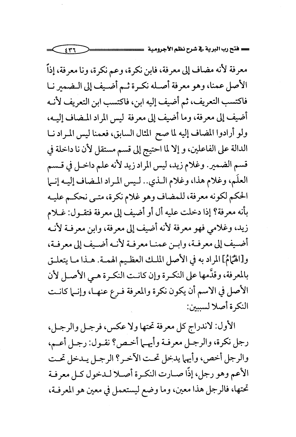 هذا معرفة مضاف إلى معرفة، فابن نكرة، وعم نكرة، ونا معرفة، إذاً الأصل عمنا، وهو معرفة أصله نكرة ثم أضيف إلى الضمير نا فاكتسب التعريف، ثم أضيف إليه ابن، فاكتسب ابن التعريف لأنه أضيف إلى معرفة، وما أضيف إلى معرفة ليس المراد المضاف إليه، ولو أرادوا المضاف إليه لما صح المثال السابق، فعمنا ليس المراد نا الدالة على الفاعلين، وإلا لما احتيج إلى قسم مستقل لأن نا داخلة في قسم الضمير. وغلام زيد، ليس المراد زيد لأنه علم داخل في قسم العلَم، وغلام هذا، وغلام الذي .. ليس المراد المضاف إليه إنما الحكم لكونه معرفة، للمضاف وهو غلام نكرة، متى نحكم عليه بأنه معرفة؟ إذا دخلت عليه أل أو أضيف إلى معرفة فتقول: غلام زيد، وغلامي فهو معرفة لأنه أضيف إلى معرفة، وابن معرفة لأنه أضيف إلى معرفة، وابن عمنا معرفة لأنه أضيف إلى معرفة، و [الهُمَامُ] المراد به في الأصل الملك العظيم الهمة. هذا ما يتعلق بالمعرفة، وقدَّمها على النكرة وإن كانت النكرة هي الأصل لأن الأصل في الاسم أن يكون نكرة والمعرفة فرع عنها، وإنما كانت النكرة أصلا لسببين: