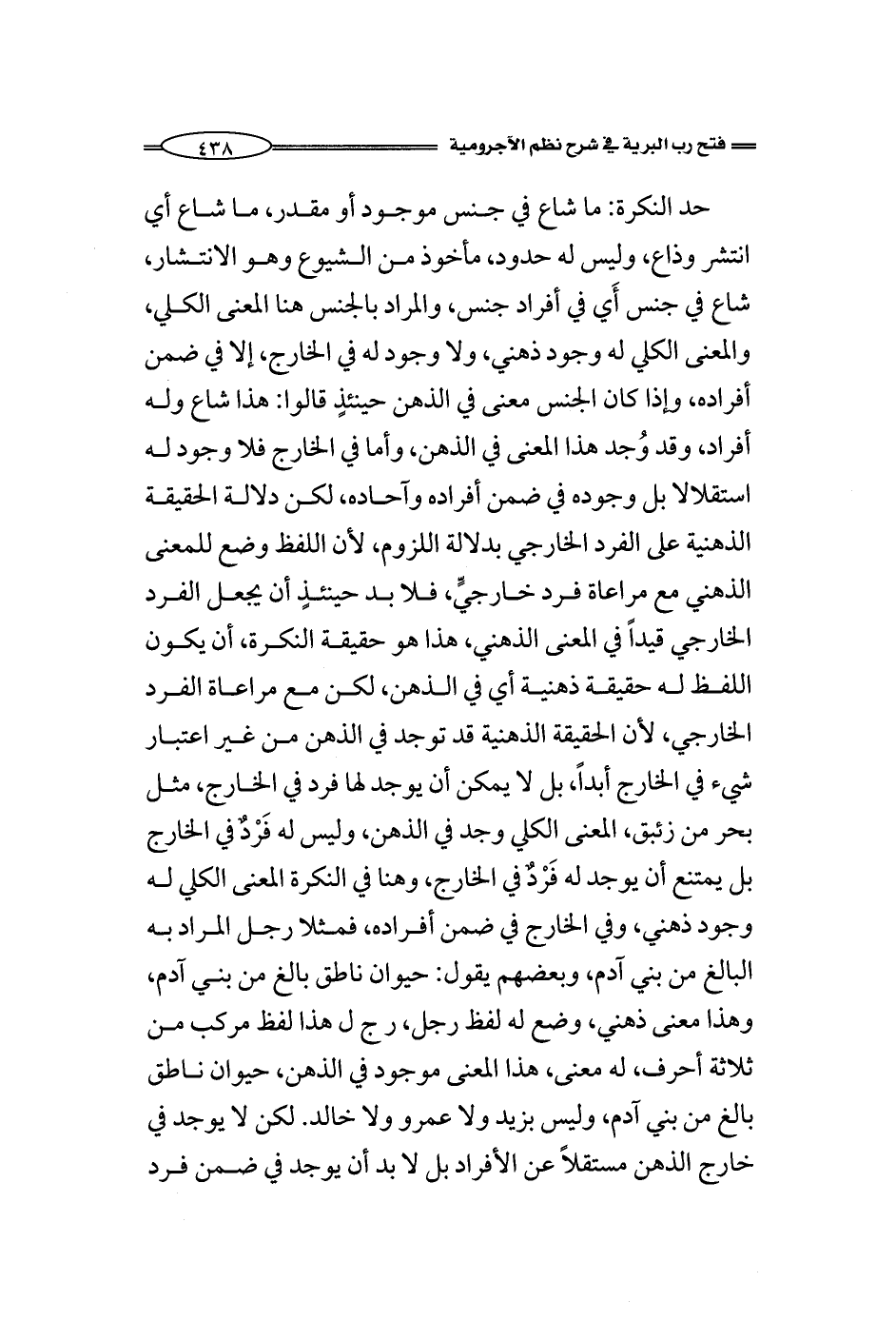 حد النكرة: ما شاع في جنس موجود أو مقدر، ما شاع أي انتشر وذاع، وليس له حدود، مأخوذ من الشيوع وهو الانتشار، شاع في جنس يعني في أفراد جنس، والمراد بالجنس هنا المعنى الكلي، والمعنى الكلي له وجود ذهني، ولا وجود له في الخارج، إلا في ضمن أفراده، وإذا كان الجنس معنى في الذهن حينئذٍ قالوا: هذا شاع وله أفراد، وُجد هذا المعنى في الذهن، وأما في الخارج فلا وجود له استقلالا بل وجوده في ضمن أفراده وآحاده، لكن دلالة الحقيقة الذهنية على الفرد الخارجي بدلالة اللزوم، لأن اللفظ وضع للمعنى الذهني مع مراعاة فرد خارجيٍّ، فلا بد حينئذٍ أن يجعل الفرد الخارجي قيداً في المعنى الذهني، هذا هو حقيقة النكرة، أن يكون اللفظ له حقيقة ذهنية أي في الذهن، لكن مع مراعاة الفرد الخارجي، لأن الحقيقة الذهنية قد توجد في الذهن وهي حقيقة ذهنية، من غير اعتبار شيء في الخارج أبداً، بل لا يمكن أن يوجد لها فرد في الخارج، مثل بحر من زئبق، المعنى الكلي وجد في الذهن، وليس له أفراد في الخارج بل يمتنع أن يوجد له أفراد في الخارج، وهنا في النكرة المعنى الكلي له وجود ذهني، وفي الخارج في ضمن أفراده، فمثلا رجل المراد به البالغ من بني آدم، وبعضهم يقول: حيوان ناطق بالغ من بني آدم، وهذا معنى ذهني، وضع له لفظ رجل، ر ج ل هذا لفظ مركب من ثلاثة أحرف، له معنى، هذا المعنى موجود في الذهن، حيوان ناطق بالغ من بني آدم، وليس بزيد ولا عمرو ولا خالد. لكن لا يوجد في خارج الذهن مستقلاً عن الأفراد بل لا بد أن يوجد في ضمن فرد