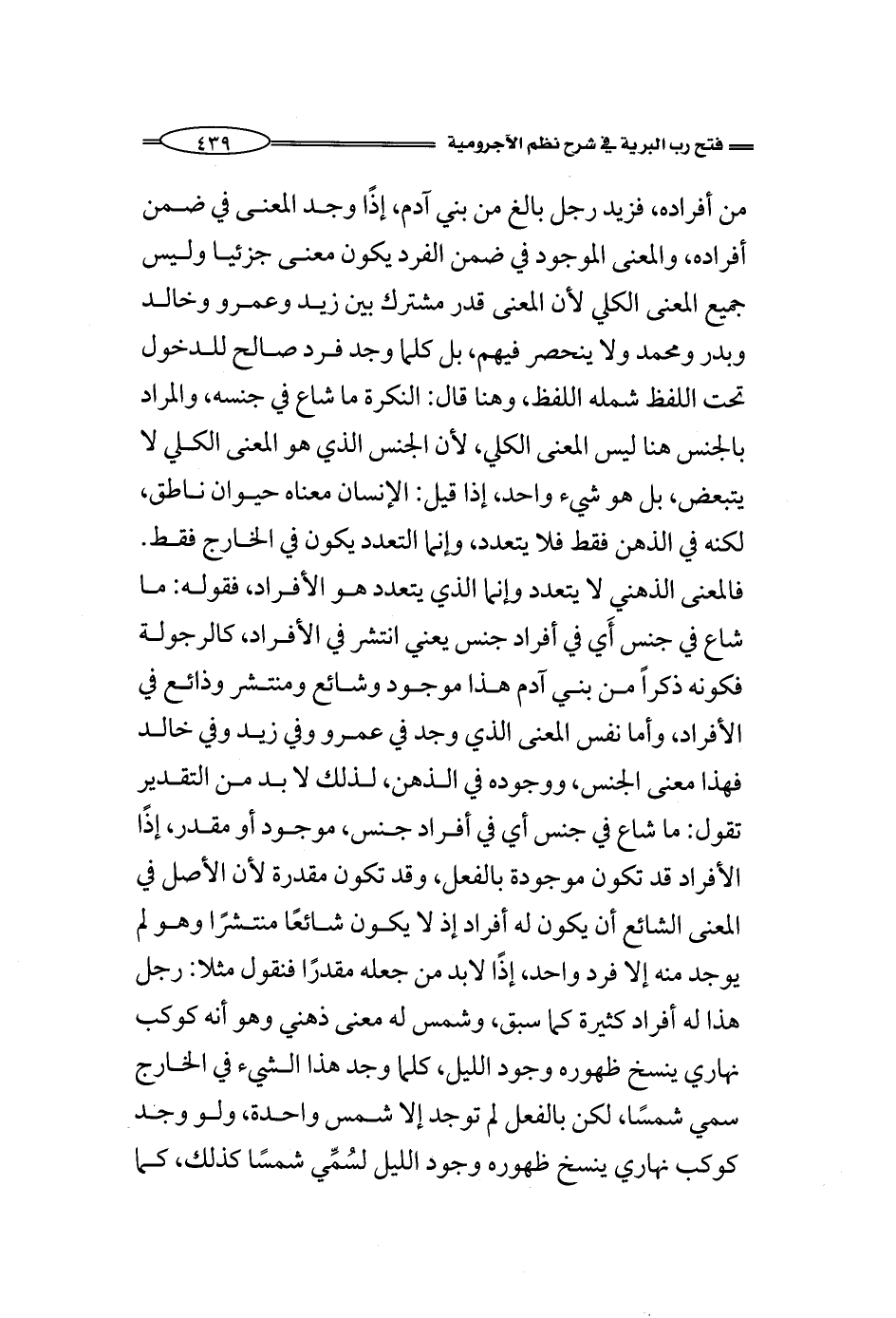 فالمعنى الذهني لا يتعدد وإنما الذي يتعدد هو الأفراد، فقوله: ما شاع في جنس يعني في أفراد جنس يعني انتشر في الأفراد، كالرجولة فكونه ذكراً من بني آدم هذا موجود وشائع ومنتشر وذائع في الأفراد، وأما نفس المعنى الذي وجد في عمرو وفي زيد وفي خالد فهذا معنى الجنس، ووجوده في الذهن، لذلك لا بد من التقدير تقول: ما شاع في جنس أي في أفراد جنس، موجود أو مقدر، إذًا الأفراد قد تكون موجودة بالفعل، وقد تكون مقدرة لأن الأصل في المعنى الشائع أن يكون له أفراد إذ لا يكون شائعًا منتشرًا وهو لم يوجد منه إلا فرد واحد، إذًا لابد من جعله مقدرًا فنقول مثلا: رجل هذا له أفراد كثيرة كما سبق، وشمس له معنى ذهني وهو أنه كوكب نهاري ينسخ ظهوره وجود الليل، كلما وجد هذا الشيء في الخارج سمي شمسًا، لكن بالفعل لم توجد إلا شمس واحدة، ولو وجد كوكب نهاري ينسخ ظهوره وجود الليل لسُمِّي شمسًا كذلك، كما
