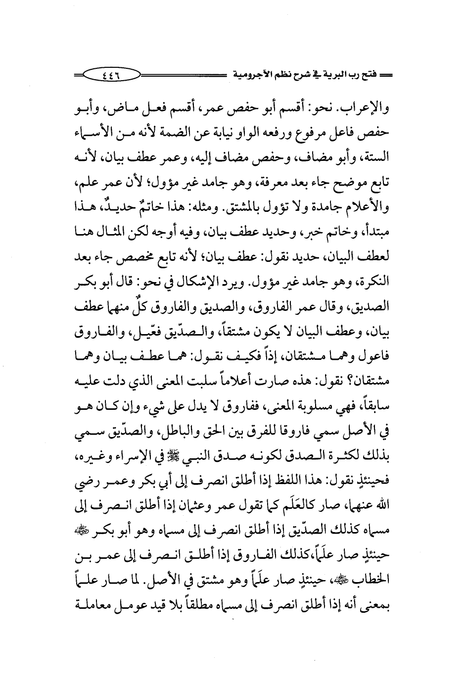 ويرد الإشكال في نحو: قال أبو بكر الصديق، وقال عمر الفاروق، والصديق والفاروق كلٌ منهما عطف بيان، وعطف البيان لا يكون مشتقاً، والصدّيق فعّيل، والفاروق فاعول وهما مشتقان، إذاً فكيف نقول: هما عطف بيان وهما مشتقان؟ نقول: هذه صارت أعلاماً سلبت المعنى الذي دلت عليه سابقاً، فهي مسلوبة المعنى، ففاروق لا يدل على شيء وإن كان هو في الأصل سمي فاروقا للفرق بين الحق والباطل، والصدّيق سمي بذلك لكثرة الصدق لكونه صدق النبي - صلى الله عليه وسلم - في الإسراء وغيره، فحينئذٍ نقول: هذا اللفظ إذا أطلق انصرف إلى أبي بكر وعمر رضي الله عنهما، صار كالعَلَم كما تقول عمر وعثمان إذا أطلق انصرف إلى مسماه كذلك الصدّيق إذا أطلق انصرف إلى مسماه وهو أبو بكر - رضي الله عنه - حينئذٍ صار علَماً، كذلك الفاروق إذا أطلق انصرف إلى عمر بن الخطاب - رضي الله عنه -، حينئذٍ صار علَماً وهو مشتق في الأصل. لما صار علماً بمعنى أنه إذا أطلق انصرف إلى مسماه مطلقاً بلا قيد عومل معاملة