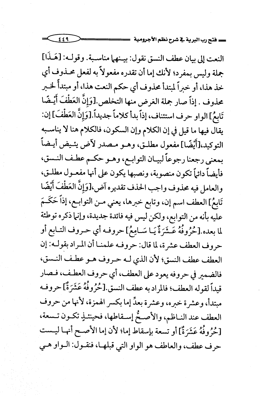 النعت إلى بيان عطف النسق نقول: بينهما مناسبة. وقوله: [هَذَا] جملة وليس بمفرد؛ لأنك إما أن تقدره مفعولاً به لفعل محذوف أي خذ هذا، أو خبراً لمبتدأ محذوف أي حكم النعت هذا، أو مبتدأً لخبر محذوف. إذاً صار جملة الغرض منها التخلص. [وَإِنَّ العَطْفَ أَيْضًا تَابِعُ] الواو حرف استئناف، إذاً بدأ كلاماً جديداً. [وَإِنَّ العَطْفَ] إن: يقال فيها ما قيل في إن الكلام وإن السكون، فالكلام هنا لا يناسبه التوكيد، [أَيْضًا] مفعول مطلق، وهو مصدر لآض يئيض أيضاً بمعنى رجعنا رجوعاً لبيان التوابع، وهو حكم عطف النسق، فأيضاً دائماً تكون منصوبة، ونصبها يكون على أنها مفعول مطلق، والعامل فيه محذوف واجب الحذف تقديره آض، [وَإِنَّ العَطْفَ أَيْضًا تَابِعُ] العطف اسم إن، وتابع خبرها، يعني من التوابع، إذاً حَكَمَ عليه بأنه من التوابع، ولكن ليس فيه فائدة جديدة، وإنما ذكره توطئة لما بعده. [حُرُوفُهُ عَشَرَةٌ يَا سَامِعُ] حروفه أي حروف التابع أو حروف العطف عشرة، لما قال: حروفه علمنا أن المراد بقوله: إن العطف عطف النسق؛ لأن الذي له حروف هو عطف النسق، فالضمير في حروفه يعود على العطف، أي حروف العطف، فصار قيداً لقوله العطف؛ فالمراد به عطف النسق. [حُرُوفُهُ عَشَرَةٌ] حروفه مبتدأ، وعشرة خبره، وعشرة بعدِّ إما بكسر الهمزة، لأنها من حروف العطف عند الناظم، والأصحُّ إسقاطها، فحينئذٍ تكون تسعة، [حُرُوفُهُ عَشَرَةٌ] أو تسعة بإسقاط إما؛ لأن إما الأصح أنها ليست حرف عطف، والعاطف هو الواو التي قبلها، فنقول: الواو هي