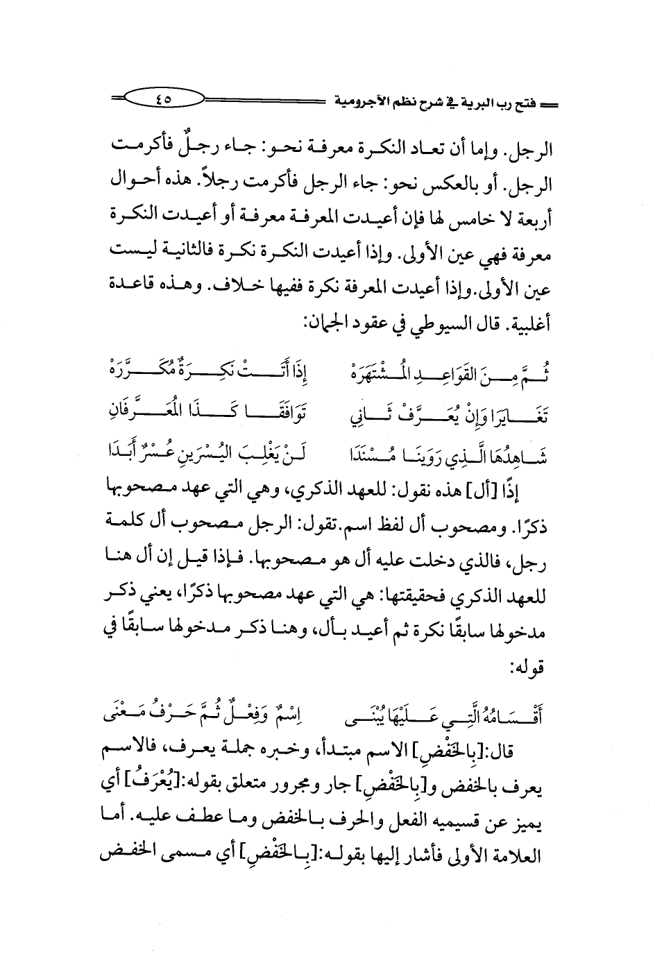 الرجل. وإما أن تعاد النكرة معرفة نحو: جاء رجلٌ فأكرمت الرجل. أو بالعكس نحو: جاء الرجل فأكرمت رجلاً. هذه أحوال أربعة لا خامس لها فإن أعيدت المعرفة معرفة أو أعيدت النكرة معرفة فهي عين الأولى. وإذا أعيدت النكرة نكرة فالثانية ليست عين الأولى. وإذا أعيدت المعرفة نكرة ففيها خلاف. وهذه قاعدة أغلبية. قال السيوطي في عقود الجمان:
