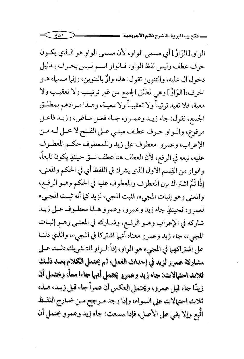 الواو. [الوَاوُ] أي مسمى الواو، لأن مسمى الواو هو الذي يكون حرف عطف وليس لفظ الواو، فالواو اسم ليس بحرف بدليل دخول أل عليه، والتنوين تقول: هذه واوٌ بالتنوين، وإنما مسماه هو الحرف، [الوَاوُ] وهي لمطلق الجمع من غير ترتيب ولا تعقيب ولا معية، فلا تفيد ترتيباً ولا تعقيباً ولا معية، وهذا مرادهم بمطلق الجمع، نقول: جاء زيد وعمرو، جاء فعل ماض، وزيد فاعل مرفوع، والواو حرف عطف مبني على الفتح لا محل له من الإعراب، وعمرو معطوف على زيد وللمعطوف حكم المعطوف عليه، تبعه في الرفع، لأن العطف هنا عطف نسق حينئذٍ يكون تابعاً، والواو من القِسم الأول الذي يشرك في اللفظ أي في الحكم والمعنى، إذًا ثَمَّ اشتراك بين المعطوف والمعطوف عليه في الحكم وهو الرفع، والمعنى وهو إثبات المجيء، فثبت المجيء لزيد كما أنه ثبت المجيء لعمرو، فحينئذٍ جاء زيد وعمرو، وعمرو هذا معطوف على زيد شاركه في الإعراب وهو الرفع، وشاركه في المعنى وهو إثبات المجيء، جاء زيد وعمرو معناه أنهما اشتركا في المجيء، والذي دلنا على اشتراكهما في المجيء هو الواو، إذاً الواو للتشريك دلت على مشاركة عمرو لزيد في إحداث الفعل، ثم يحتمل الكلام بعد ذلك ثلاث احتمالات: جاء زيد وعمرو يحتمل أنهما جاءا معاً، ويحتمل أن زيدًا جاء قبل عمرو، ويحتمل العكس أن عمراً جاء قبل زيد، هذه ثلاث احتمالات على السواء، وإذا وجد مرجح من خارج اللفظ اتُّبع وإلا بقي على الأصل، فإذا سمعت: جاء زيد وعمرو يحتمل أن