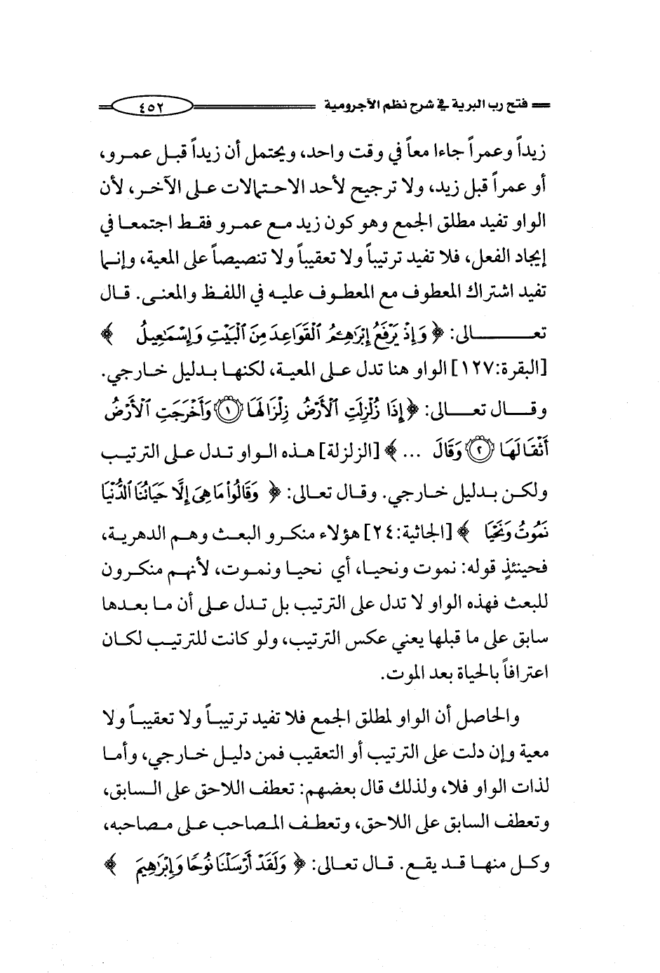 والحاصل أن الواو لمطلق الجمع فلا تفيد ترتيباً ولا تعقيباً ولا معية وإن دلت على الترتيب أو التعقيب فمن دليل خارجي، وأما لذات الواو فلا، ولذلك قال بعضهم: تعطف اللاحق على السابق، وتعطف السابق على اللاحق، وتعطف المصاحب على مصاحبه، وكل منها قد يقع. قال تعالى: (وَلَقَدْ أَرْسَلْنَا نُوحًا وَإِبْرَاهِيمَ)
