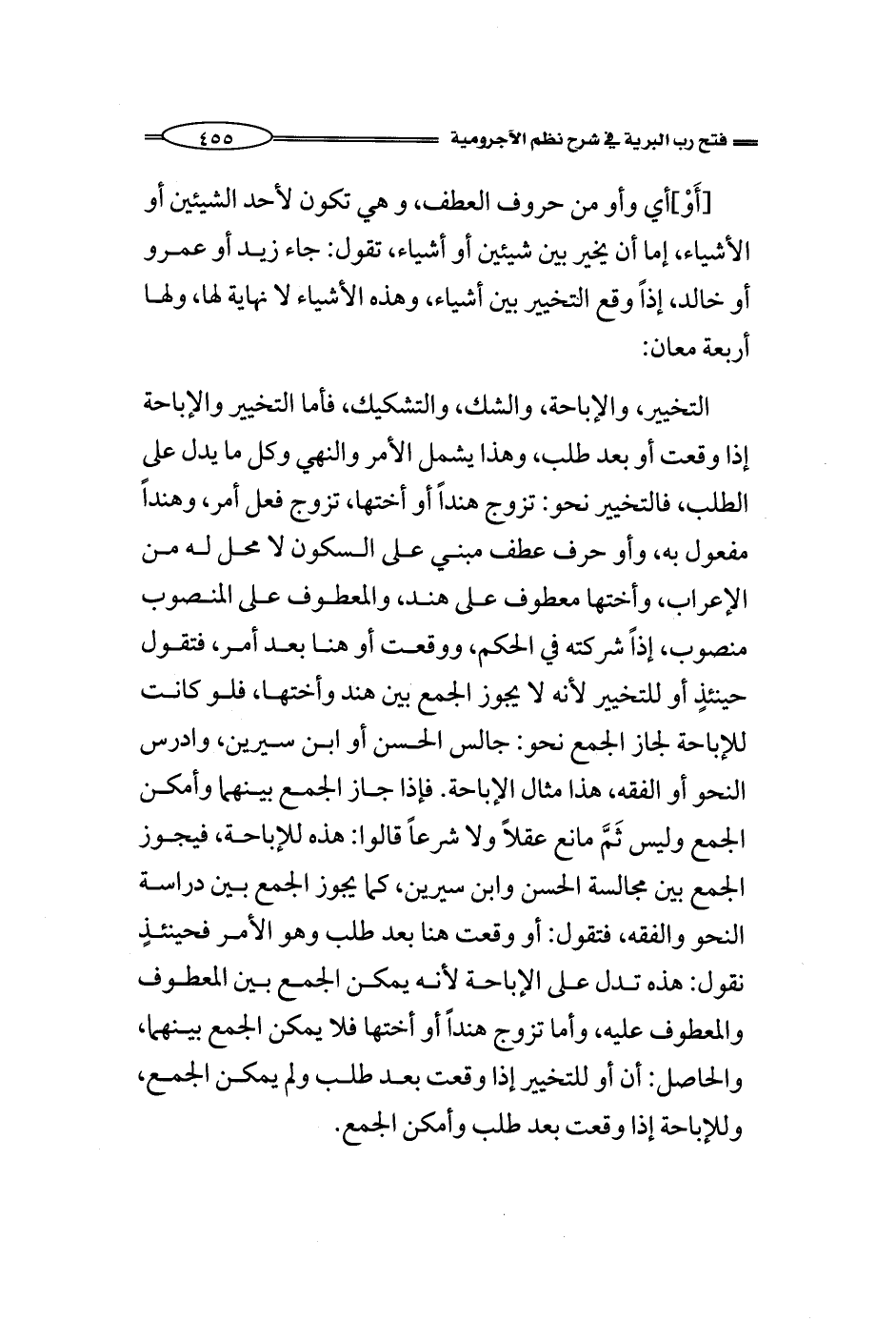 التخيير، والإباحة، والشك، والتشكيك، فأما التخيير والإباحة إذا وقعت أو بعد طلب، وهذا يشمل الأمر والنهي وكل ما يدل على الطلب، فالتخيير نحو: تزوج هنداً أو أختها، تزوج فعل أمر، وهنداً مفعول به، وأو حرف عطف مبني على السكون لا محل له من الإعراب، وأختها معطوف على هند، والمعطوف على المنصوب منصوب، إذاً شركته في الحكم، ووقعت أو هنا بعد أمر، فتقول حينئذٍ أو للتخيير لأنه لا يجوز الجمع بين هند وأختها، فلو كانت للإباحة لجاز الجمع نحو: جالس الحسن أو ابن سيرين، وادرس النحو أو الفقه، هذا مثال الإباحة. فإذا جاز الجمع بينهما وأمكن الجمع وليس ثَمَّ مانع عقلاً ولا شرعاً قالوا: هذه للإباحة، فيجوز الجمع بين مجالسة الحسن وابن سيرين، كما يجوز الجمع بين دراسة النحو والفقه، فتقول: أو وقعت هنا بعد طلب وهو الأمر فحينئذٍ نقول: هذه تدل على الإباحة لأنه يمكن الجمع بين المعطوف والمعطوف عليه، وأما تزوج هنداً أو أختها فلا يمكن الجمع بينهما، والحاصل: أن أو للتخيير إذا وقعت بعد طلب ولم يمكن الجمع، وللإباحة إذا وقعت بعد طلب وأمكن الجمع.