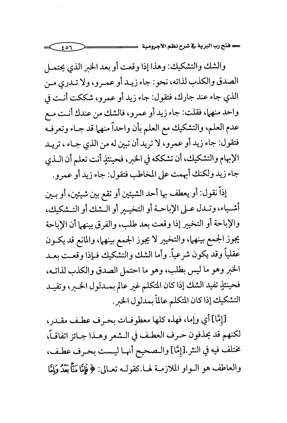 [إِمَّا] أي وإما، فهذه كلها معطوفات بحرف عطف مقدر، لكنهم قد يحذفون حرف العطف في الشعر وهذا جائز اتفاقاً، مختلف فيه في النثر. [إِمَّا] والصحيح أنها ليست بحرف عطف، والعاطف هو الواو الملازمة لها. كقوله تعالى: (فَإِمَّا مَنًّا بَعْدُ وَإِمَّا