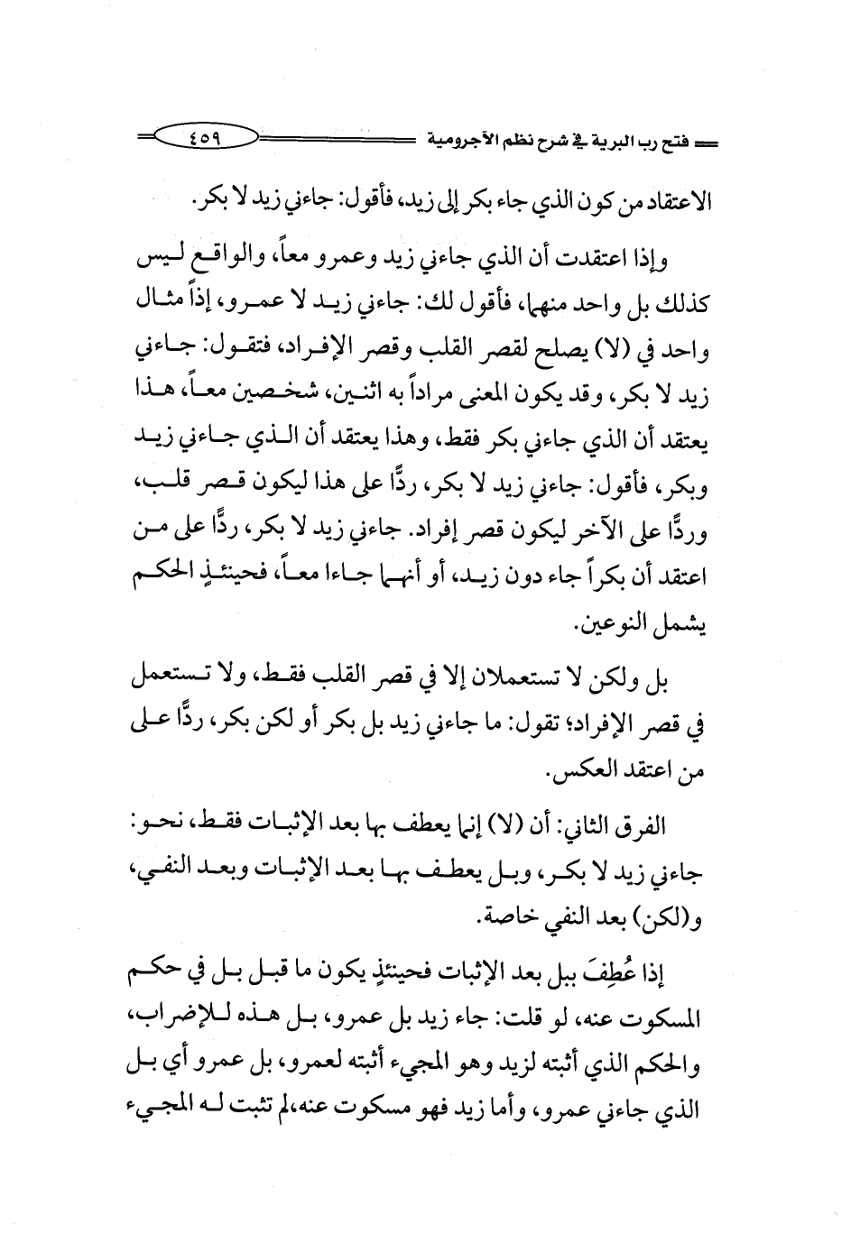 وإذا اعتقدت أن الذي جاءني زيد وعمرو معاً، والواقع ليس كذلك بل واحد منهما، فأقول لك: جاءني زيد لا عمرو، إذاً مثال واحد في (لا) يصلح لقصر القلب وقصر الإفراد، فتقول: جاءني زيد لا بكر، وقد يكون المعنى مراداً به اثنين، شخصين معاً، هذا يعتقد أن الذي جاءني بكر فقط، وهذا يعتقد أن الذي جاءني زيد وبكر، فأقول: جاءني زيد لا بكر، ردًّا على هذا ليكون قصر قلب، وردًّا على الآخر ليكون قصر إفراد. جاءني زيد لا بكر، رد على من اعتقد أن بكراً جاء دون زيد، أو أنهما جاءا معاً، فحينئذٍ الحكم يشمل النوعين.