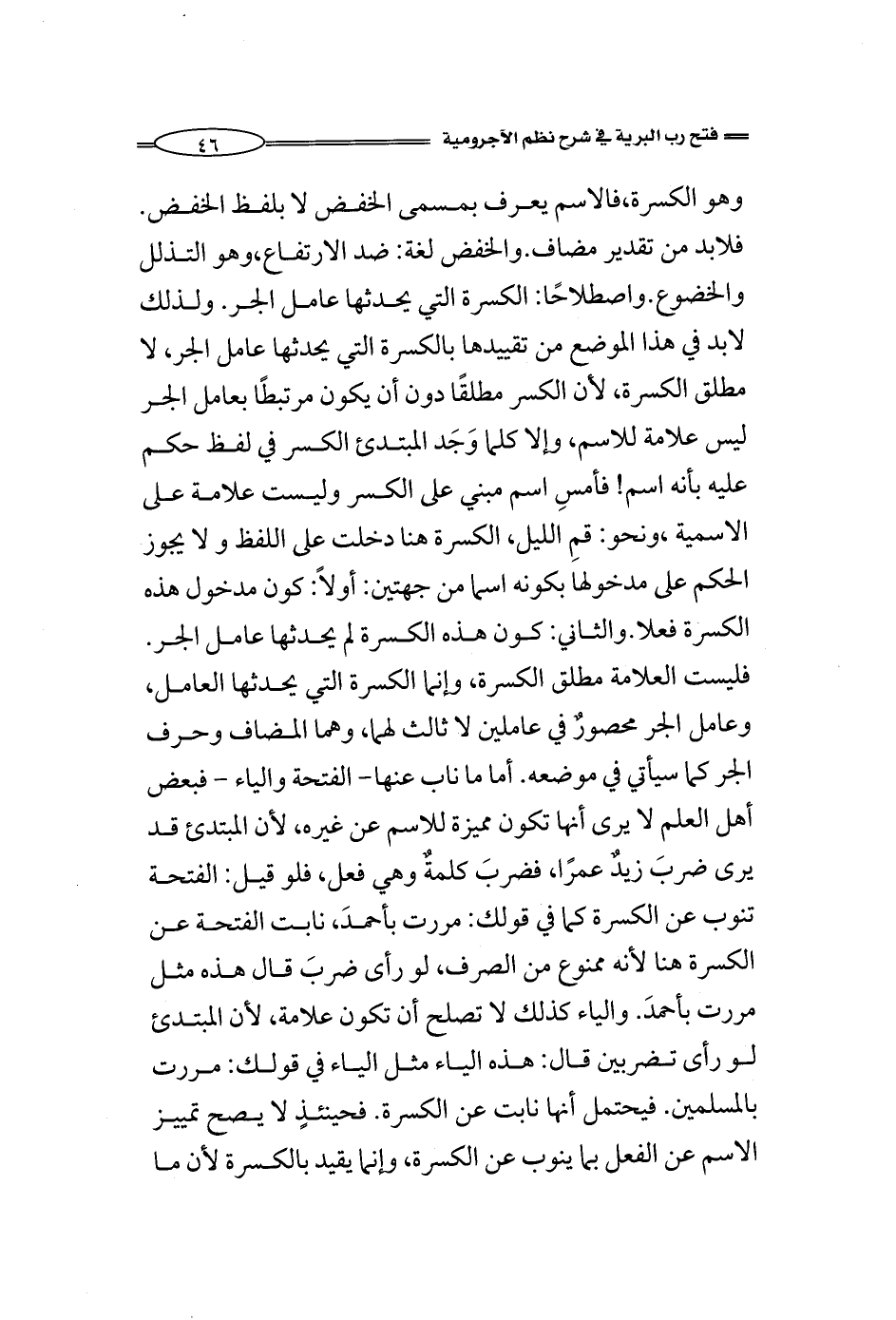 وهو الكسرة، فالاسم يعرف بمسمى الخفض لا بلفظ الخفض. فلابد من تقدير مضاف. والخفض لغة: ضد الارتفاع، وهو التذلل والخضوع. واصطلاحًا: الكسرة التي يحدثها عامل الجر. ولذلك لابد في هذا الموضع من تقييدها بالكسرة التي يحدثها عامل الجر، لا مطلق الكسرة، لأن الكسر مطلقًا دون أن يكون مرتبطًا بعامل الجر ليس علامة للاسم، وإلا كلما وَجَد المبتدئ الكسر في لفظ حكم عليه بأنه اسم! فأمسِ اسم مبني على الكسر وليست علامة على الاسمية، ونحو: قمِ الليل، الكسرة هنا دخلت على اللفظ ولا يجوز الحكم على مدخولها بكونه اسما من جهتين: أولاً: كون مدخول هذه الكسرة فعلا. والثاني: كون هذه الكسرة لم يحدثها عامل الجر. فليست العلامة مطلق الكسرة، وإنما الكسرة التي يحدثها العامل، وعامل الجر محصورٌ في عاملين لا ثالث لهما، وهما المضاف وحرف الجر كما سيأتي في موضعه. أما ما ناب عنها- الفتحة والياء - فبعض أهل العلم لا يرى أنها تكون مميزة للاسم عن غيره، لأن المبتدئ قد يرى ضربَ زيدٌ عمرًا، فضربَ كلمةٌ وهي فعل، فلو قيل: الفتحة تنوب عن الكسرة كما في قولك: مررت بأحمدَ، نابت الفتحة عن الكسرة هنا لأنه ممنوع من الصرف، لو رأى ضربَ قال هذه مثل مررت بأحمدَ. والياء كذلك لا تصلح أن تكون علامة، لأن المبتدئ لو رأى تضربين قال: هذه الياء مثل الياء في قولك: مررت بالمسلمين. فيحتمل أنها نابت عن الكسرة. فحينئذٍ لا يصح تمييز الاسم عن الفعل بما ينوب عن الكسرة، وإنما يقيد بالكسرة لأن ما