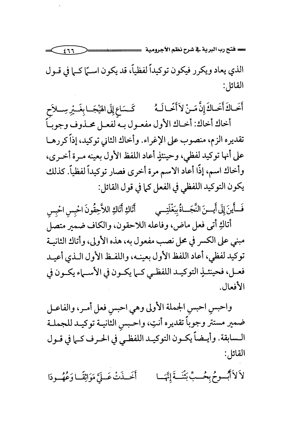 أخاك أخاك: أخاك الأول مفعول به لفعل محذوف وجوباً تقديره الزم، منصوب على الإغراء. وأخاك الثاني توكيد، إذاً كررها على أنها توكيد لفظي، وحينئذٍ أعاد اللفظ الأول بعينه مرة أخرى، وأخاك اسم، إذاً أعاد الاسم مرة أخرى فصار توكيداً لفظياً. كذلك يكون التوكيد اللفظي في الفعل كما في قول القائل: