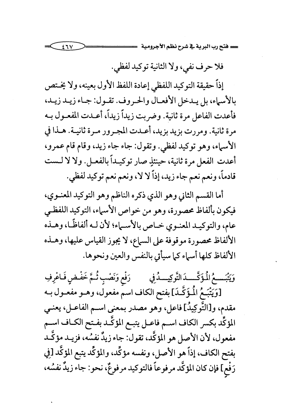 [وَيَتْبَعُ المُؤَكَّدَ] بفتح الكاف اسم مفعول، وهو مفعول به مقدم، و [التَّوكِيدُ] فاعل، وهو مصدر بمعنى اسم الفاعل، يعني المؤكِّد بكسر الكاف اسم فاعل يتبع المؤكَّد بفتح الكاف اسم مفعول، لأن الأصل هو المؤكَّد، تقول: جاء زيدٌ نفسُه، فزيد مؤكَّد بفتح الكاف، إذاً هو الأصل، ونفسه مؤكِّد، والمؤكِّد يتبع المؤكَّد [فِي رَفْعٍ] فإن كان المؤكَّد مرفوعاً فالتوكيد مرفوعٌ، نحو: جاء زيدٌ نفسُه،