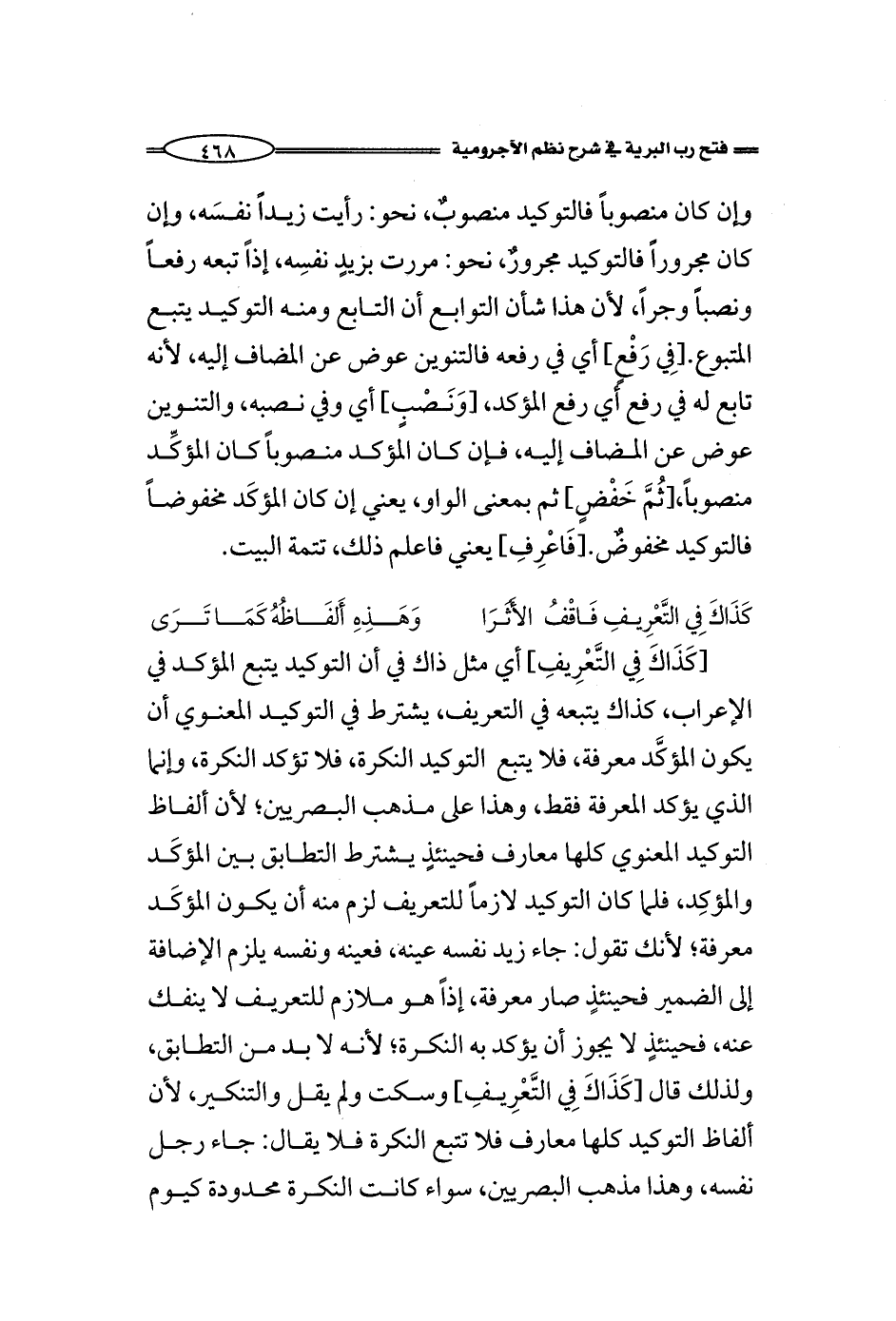 وإن كان منصوباً فالتوكيد منصوبٌ، نحو: رأيت زيداً نفسَه، وإن كان مجروراً فالتوكيد مجرورٌ، نحو: مررت بزيدٍ نفسِه، إذاً تبعه رفعاً ونصباً وجراً، لأن هذا شأن التوابع أن التابع ومنه التوكيد يتبع المتبوع. [فِي رَفْعٍ] أي في رفعه فالتنوين عوض عن المضاف إليه، لأنه تابع له في رفع أي رفع المؤكد، [وَنَصْبٍ] أي وفي نصبه، والتنوين عوض عن المضاف إليه، فإن كان المؤكد منصوباً كان المؤكِّد منصوباً، [ثُمَّ خَفْضٍ] ثم بمعنى الواو، يعني إن كان المؤكَد مخفوضاً فالتوكيد مخفوضٌ. [فَاعْرِفِ] يعني فاعلم ذلك، تتمة البيت.