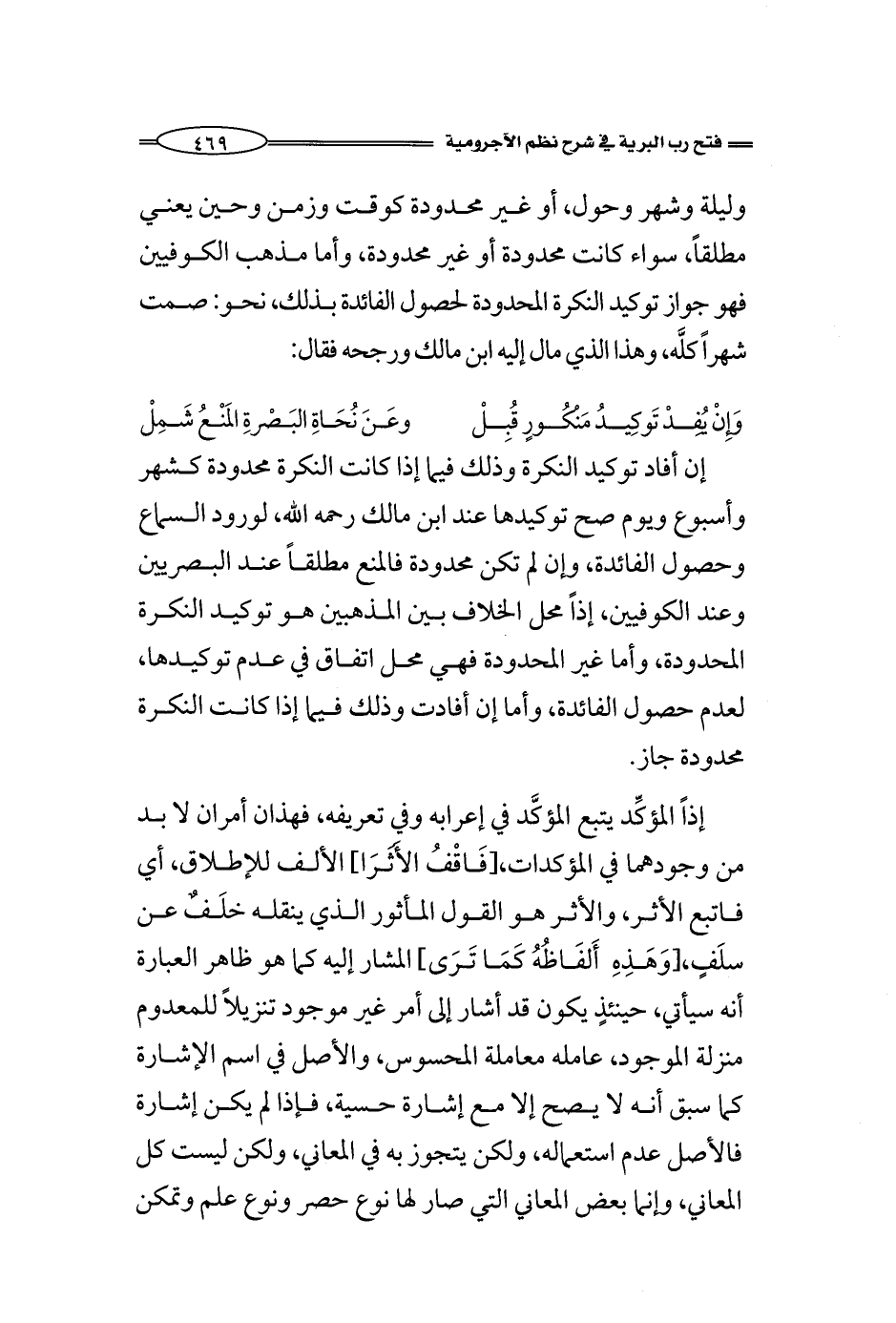 وليلة وشهر وحول، أو غير محدودة كوقت وزمن وحين يعني مطلقاً، سواء كانت محدودة أو غير محدودة، وأما مذهب الكوفيين فهو جواز توكيد النكرة المحدودة لحصول الفائدة بذلك، نحو: صمت شهراً كلَّه، وهذا الذي مال إليه ابن مالك ورجحه فقال: