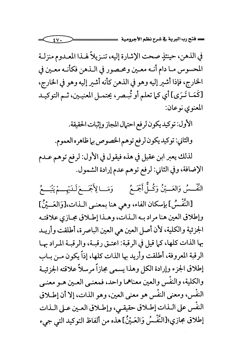 [النَّفْسُ] بإسكان الفاء، وهي هنا بمعنى الذات، [وَالعَيْنُ] وإطلاق العين هنا مراد به الذات، وهذا إطلاق مجازي علاقته الجزئية والكلية، لأن أصل العين هي العين الباصرة، أطلقت وأريد بها الذات كلها، كما قيل في الرقبة: اعتق رقبة، والرقبة المراد بها الرقبة المعروفة، أطلقت وأريد بها الذات كلها، إذاً يكون من باب إطلاق الجزء وإرادة الكل وهذا يسمى مجازاً مرسلاً علاقته الجزئية والكلية، والنفْس والعين معناهما واحد، فمعنى العين هو معنى النفْس، ومعنى النفْس هو معنى العين، وهو الذات، إلا أن إطلاق النفْس على الذات إطلاق حقيقي، وإطلاق العين على الذات إطلاق مجازي؛ [النَّفْسُ وَالعَيْنُ] هذه من ألفاظ التوكيد التي جيء